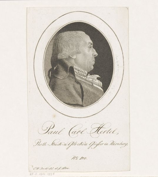 This is a portrait of Ernst Christoph Grattenauer by Christoph-Wilhelm Bock, rendered as an etching. Grattenauer was a German writer and publicist known for his conservative political views. This formal portrait, with its classical oval frame, speaks to the conventions of representing public figures at the time. Portraits like these helped establish and reinforce social hierarchies. Grattenauer’s profile, carefully detailed, emphasizes his status and respectability within Prussian society. What’s interesting here is considering how the medium of printmaking allowed for wider distribution of such images. It enabled the dissemination of political ideologies and the construction of public personas. Understanding this portrait requires that we consider not just the sitter and the artist, but also the broader social and political context of late 18th-century Prussia. We can consult period publications, archival records, and other historical sources to better understand the image. The meaning of art is always contingent on its social and institutional context.