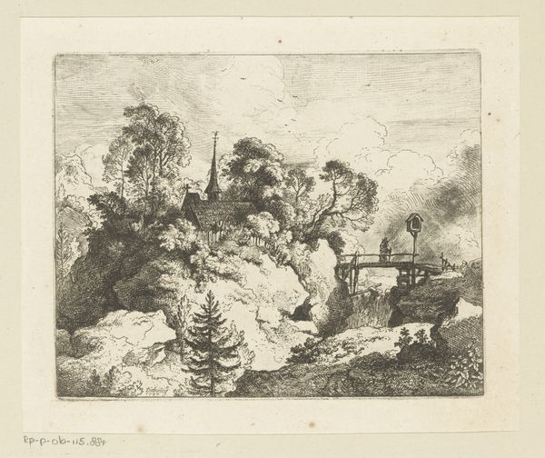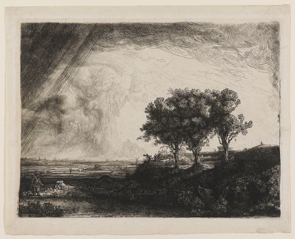 Editor: This is "The Three Trees, after Rembrandt," an etching from 1758 by Captain William Baillie, now residing at The Met. The dramatic sky makes the scene feel incredibly ominous and powerful to me, contrasting the relatively still trees. What compositional elements stand out to you? Curator: Indeed. Let's focus on the organization of pictorial space. Note the artist's strategic use of diagonal lines, directing our gaze from the illuminated lightning strike down towards the darkened foreground. Baillie, a later copyist, adopts a highly textured surface. Notice how this texture, achieved through the etching process, lends itself to dramatic light effects, particularly across the cloud formations. Editor: I see what you mean about the diagonals; the eye definitely moves quickly through the picture plane. The density of marks also contributes a sense of immediacy, despite the calculated composition. But if it's a copy, does it have value on its own? Curator: A fair question. We must consider Baillie's technical choices in the context of printmaking. His lines, heavier and more deliberate than what is observed of Rembrandt’s prints, shift our emphasis from line work to light and texture; observe this in relation to Baroque values regarding luminosity and affect. While inspired by the Dutch master, Baillie’s etching is an interpretative response. We have the original in a different room if you’re interested? Editor: Yes, definitely, it would be insightful to study both up close to determine how much was adapted from the source versus imagined anew. Curator: Excellent. Looking at it from this lens makes one conscious of the dialogue, as opposed to the derivative approach, adopted by Baillie with Rembrandt.