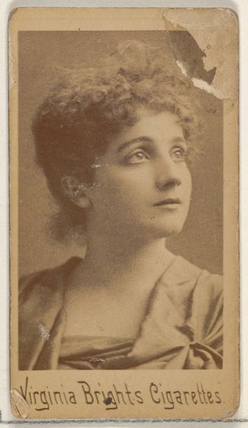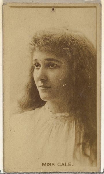 Curator: Here we have an albumen print from around 1890-1895, part of the "Actors and Actresses" series, created by W. Duke, Sons & Co. as promotional material for Duke Cigarettes. The photograph features an actress in costume. Editor: The sepia tone gives it an antique feel. There is a certain theatricality at play, obviously heightened by the elaborate conical hat. It's captivating, though—a bit mysterious too, with that upward gaze. Curator: Absolutely. The series offers us a fascinating glimpse into the commercialization of celebrity culture during that period. Cigarette cards like these were incredibly popular. What better way to advertise than to put the images of admired stage performers on them? Editor: Think of the production scale. The labor involved in churning out thousands, if not millions, of these images. What sort of machinery and division of labour would be employed? It's mass consumption embodied in one little card. How many hands did this card pass through, from creation to discard? Curator: Precisely. And the power of imagery to influence tastes and desires. Note how Duke Sons & Co. carefully constructed a connection between smoking their cigarettes and being somehow associated with the glamour of the theater, the actress’ world. Editor: The actress's costume is key. That hat. Was it authentic to a role she was playing, or just an orientalizing flourish? Because it is neither convincingly "oriental" nor does it successfully copy Western forms, revealing that, for all that supposed authenticity, it is largely just manufactured out of nothing, for show and mass sale. Curator: Yes! These cigarette cards weren’t just portraits; they were meticulously crafted marketing tools reflecting and shaping contemporary notions of beauty and entertainment. You can feel that dynamic even now. It wasn't pure representation, it was carefully curated projection. Editor: Exactly, and now we're projecting our interpretations onto it. To look at a portrait like this invites one to re-examine labor processes that we overlook. Next time you buy a packet of something from your store, take a moment and pause to consider how the object in question came into your possession. Curator: It’s a potent reminder of how even seemingly ephemeral items like these can tell us so much about our cultural history. Editor: I see so much more than a sepia photograph, I now see processes, labor, capitalist logic at work! Thank you.