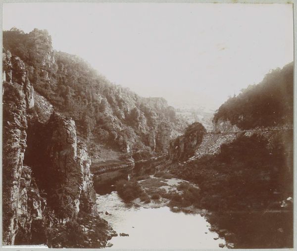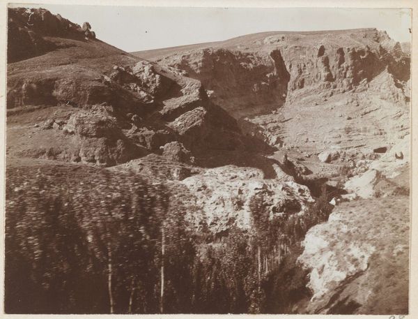 Editor: Here we have Delizy’s “Man in een kloof van de Gorges du Cians in de Alpes-Maritimes," taken in 1903. It’s an albumen print that captures a gorge with a lone figure in the distance. There’s such a powerful sense of scale! How do you interpret this work? Curator: I see this as a fascinating example of pictorialism grappling with emerging notions of masculinity and man's relationship with nature at the turn of the century. Consider the socio-political context: colonial expansion was at its peak, and the ‘heroic explorer’ was a dominant figure. Does this image reinforce or challenge that ideal? Editor: That's interesting! I hadn't considered the connection to colonialism. I suppose I was focused on the romantic aspects of nature. Curator: Right, but let's unpack that romanticism. The lone man is dwarfed by the landscape, rendered in sepia tones which evoke a sense of the past. Is he mastering nature, or being consumed by it? Think about how notions of race, gender and power dynamics intertwine here. The "untouched" landscape itself is a construct, isn't it? Editor: So, it's less about celebrating nature and more about questioning the power dynamics inherent in how we perceive it? The photographic process itself as an act of claiming or knowing, perhaps? Curator: Precisely! And think about whose gaze is privileged here. Who is this photograph intended for? How does it participate in constructing ideas about "otherness," or even French national identity, through its depiction of this landscape and its tiny, almost insignificant figure? Editor: I see it now. It’s making me rethink the whole idea of landscape photography and the assumptions it carries. Thank you. Curator: Absolutely. These images are rarely just pretty pictures. They're steeped in history, politics, and cultural biases that we need to actively interrogate.