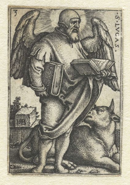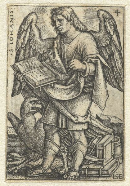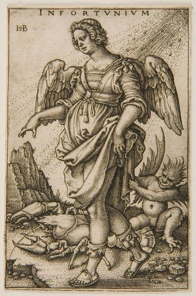 Editor: Here we have Sebald Beham’s engraving, *Kennis (Cognitio)*, from 1539, currently at the Rijksmuseum. It's a small print, isn’t it? The detail is just incredible. I am drawn to how he creates a sense of depth, and that texture through the line work is remarkable. What do you make of its composition? Curator: The engraving's impact rests largely on the mastery of line. Observe how Beham varies line weight and density to create light and shadow, lending the figure of *Cognitio* a three-dimensionality despite the print’s inherent flatness. Note the almost obsessive detail in the rendering of the drapery, feathers, and even the texture of the skin. It all seems deliberately arranged; even that index finger gestures, drawing your eye across the image. Do you find its meticulous construction compelling? Editor: Absolutely. The index finger and wings give me this feeling of something otherworldly and ephemeral about it, despite the earthiness of the other textures, like the fabric folds or books. Curator: Precisely. Beham exploits the contrast between the ethereal – what with the winged allegory of Knowledge itself – and the earthly to establish a hierarchy within the image. This visual dichotomy, rendered through line alone, is where the engraving finds its power. Even the choice to position the books and earthly objects in the foreground forces us to acknowledge the grounded nature of knowledge itself. Editor: So the key is how line is used to build structure, depth and even meaning in the work. Curator: Indeed. It’s in that construction, the thoughtful and deliberate rendering of form through line, that the work transcends mere representation. We grasp a clear structure through these carefully applied techniques, revealing a rich visual system to appreciate. Editor: Thanks so much! I'm seeing much more now. Curator: It's all in the art of seeing; what one selects as significant informs the value, and the image unfolds accordingly.