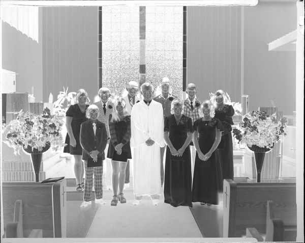 Editor: This photograph by John Deusing, *Untitled (bridal party posed in studio)*, presents an intriguing reversal of light and shadow, offering a ghostly vision of what appears to be a wedding party. It's as if the artist wanted to capture more than just the image of the party, but its soul. What catches your eye? Curator: It’s that soulfulness, precisely! The high contrast amplifies the inherent drama of the event, doesn’t it? I wonder if the choice to print it this way was a way to underscore a certain vulnerability? The image feels both present and hauntingly distant. What a moment to capture! Editor: Vulnerability? That's insightful. The uniforms and formal wear seem to convey strength and stability, but I see your point. Thanks! Curator: Of course. And who knows? Perhaps the bride or groom felt a flutter of something akin to the image itself, a world turned upside down. Food for thought!
