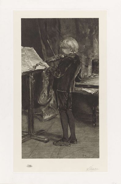 Editor: So, this is Jacob Maris’s "Portret van Willem Matthijs Maris, met viool" from sometime between 1872 and 1899. It's watercolor, and there's something really intimate and quiet about it, the somber colors seem to absorb the sound around the musician. How do you interpret the context around a work like this? Curator: The subdued tones certainly invite introspection. Considering the period, the rise of the bourgeois class deeply impacted artistic patronage. Portraiture shifted from solely commemorating the elite to reflecting the aspirations and domestic life of a wider segment of society. Does the portrayal of a young boy, presumably within the artist's family given the title, tell us something about evolving social values related to childhood, music, and education? Editor: That's a great question. I see the social shift reflected in the art, for sure. He isn’t posed stiffly as if in a more formal, commissioned piece. I suppose he looks to be at ease, perhaps caught in a private moment, which reflects that different artistic intent. Curator: Exactly! How might the emerging art market, with galleries and critics playing increasingly prominent roles, have shaped Maris’s choice of subject matter and his painterly, almost impressionistic style in what is nominally a portrait? Was he appealing to new sensibilities or establishing a new public persona of himself? Editor: That’s fascinating; thinking about it less as a simple portrait and more of a calculated artistic statement in a changing cultural landscape… It makes the painting seem much more complex. Curator: Precisely. Understanding art means also understanding how artistic styles and themes emerge and function within specific historical, social, and economic ecosystems. The artwork itself, after all, doesn’t exist in isolation. Editor: Definitely something to think about! It's been great unpacking this piece from a socio-historical perspective; it sheds a new light on this gentle, muted work.