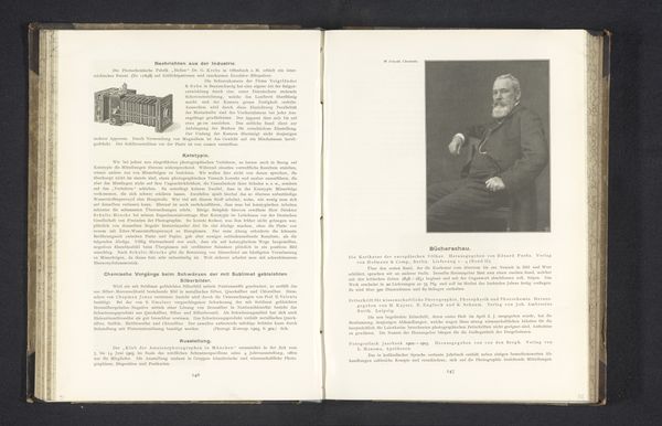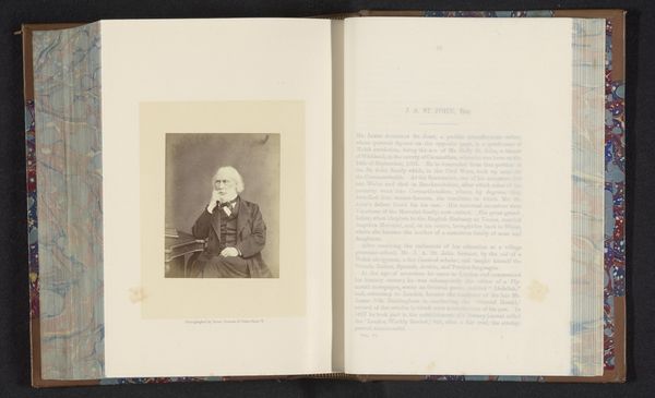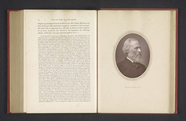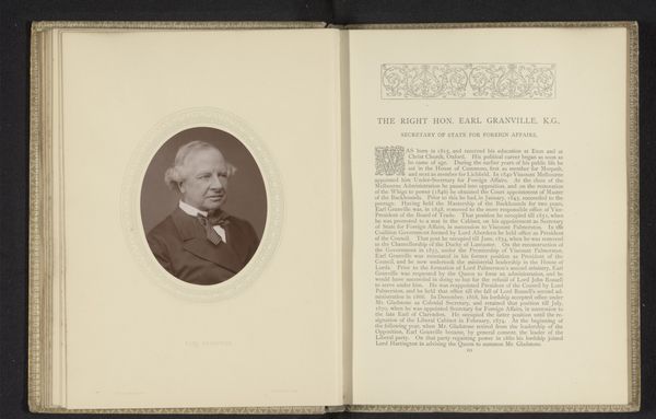 Curator: This is a photographic print of Robert Browning, taken before 1881 by Lock & Whitfield. It's a study in contrasts, laid out across these facing pages. What are your initial thoughts? Editor: Well, initially it feels like two different eras are talking to each other. You've got this warm, sepia-toned image, a soft oval portrait of Browning—almost romantic. Then right next to it, cold, hard biographical text. Curator: Precisely. The photographic print is a tonal marvel, exhibiting exquisite contrast despite its limited palette. Consider the textural richness conveyed in Browning's beard. Notice also the geometric frame, which draws our attention to the subject’s posture. Editor: Absolutely. It's like they wanted to contain the wild, creative energy of the man within this very rigid, academic structure. Look how sharp the text contrasts with the soft, rounded frame of his image. The way the text defines his accomplishments… Curator: And note the almost decorative arrangement of the textual block. Its interplay with the adjacent image provides a semiotic echo of Browning’s formal contributions to the Victorian dramatic monologue. Editor: I love that, you know, because reading between the lines—or maybe just staring at his profile—you sense this rebellious spirit. A little mischievous. You wouldn’t know that from just looking at this stuffy academic summary. Curator: It is precisely this tension between personal expression and formal convention that defines so much of Browning’s work, even finding voice in photographic practices of the late nineteenth century. Editor: It really does become a little visual poem itself. This sort of opposition between portrait and written life… It makes you wonder which is the real Browning. Perhaps, both are performances of the man. Curator: Indeed, and viewing the artwork through the lens of performativity deepens our understanding, offering us space to rethink not only the work but also our own methods. Editor: That is very insightful and worth considering further. Thanks.