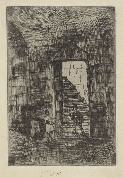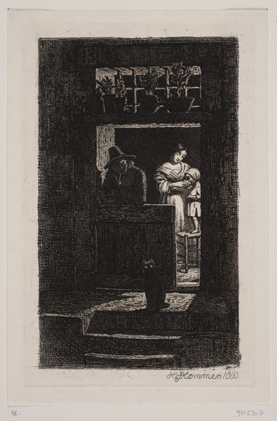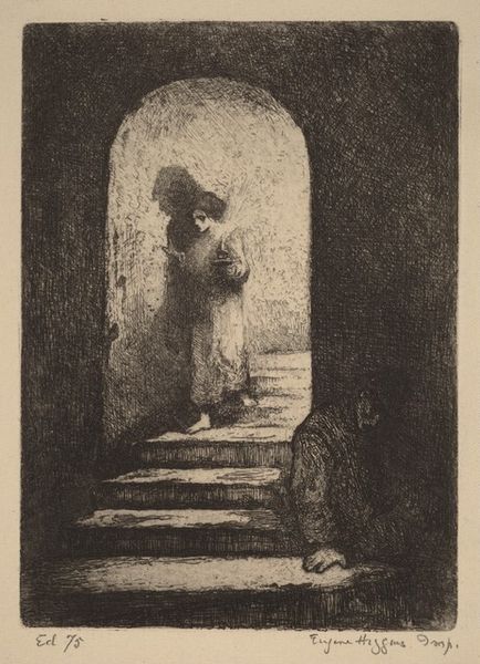 Gerard Jan Bos created this etching, "Study of an Interior with Stove," sometime between 1875 and 1943, capturing a quiet domestic scene. Bos, born in the Netherlands, lived through a period of industrial and social change, and his intimate interior scenes reflect a focus on daily life. The humble setting invites us to consider the realities of class and labor. What does the presence of a stove, simple tools and a clog tell us about labor, domesticity, and the lives of working-class people during this era? How is our perception of ‘home’ shaped by the unseen labor required to maintain it? Bos's choice of a commonplace subject elevates the ordinary, prompting us to find beauty and value in the everyday. In a time of rapid change, Bos seems to find solace in the simple, enduring aspects of human experience. This etching reminds us to consider the stories embedded in our own surroundings, and to value the often-unseen labor that shapes our daily lives.