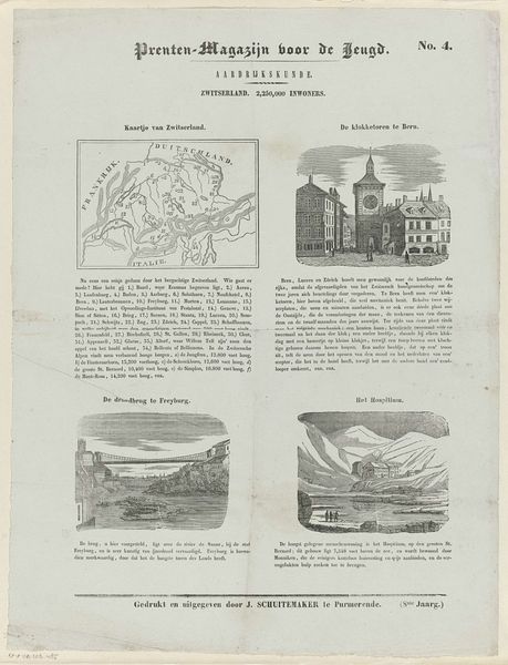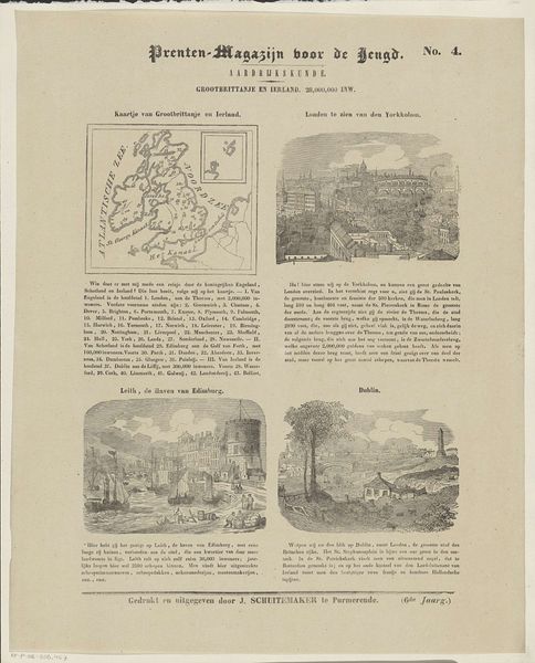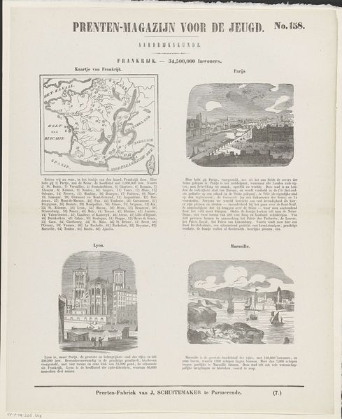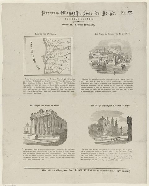 Editor: Here we have “De provincie Zeeland,” a print by Willem Bal, created sometime between 1850 and 1881. It appears to be a collection of different scenes in the province. Given the varied imagery and almost textbook-like presentation, I’m wondering what its purpose might have been. How do you interpret this work in terms of its social context? Curator: This image strikes me as a fascinating piece of visual propaganda and perhaps even historical revisionism packaged for juvenile consumption. Consider its placement within a “Prenten-Magazijn voor de Jeugd”—literally, a picture magazine for youth. What lessons about Zeeland are being imparted through these carefully chosen scenes? Editor: Lessons? You think it's pushing a particular agenda? Curator: Absolutely. Note the scenes: a detailed map perhaps instilling regional pride or awareness, a dramatic shipwreck narrative reinforcing Zeeland’s maritime identity and its struggles against the sea. There's even a church ablaze! All contribute to a constructed narrative of Zeeland's history and character, one aimed at shaping the values and beliefs of young readers, through a blend of geography, tragedy, and even civic pride displayed by the statue of Jacob Cats. Who controls the narrative, controls the present. What do you think, do these isolated events make for cohesive, if not somewhat forced, Zeeland identity? Editor: It's eye-opening how these images, seemingly innocent, are carefully selected to construct a specific idea of Zeeland for young audiences. I never considered how even something like a children’s magazine could play a role in shaping public perception of history and regional identity. Curator: Precisely. By examining the magazine’s images we gain understanding of historical manipulation tactics, a stark reminder to approach seemingly innocuous cultural artefacts critically.