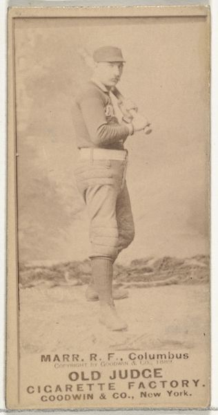 Curator: There's something unexpectedly tender about this card, a relic of a bygone era. It’s Arline Stanley from the "Actors and Actresses" series, a promotional card produced by Allen & Ginter for Virginia Brights Cigarettes sometime between 1885 and 1891. I imagine it was slipped right into the cigarette pack. Editor: You know, tender isn't the first word that comes to mind. There's an undeniable sense of the exotic and performative, even objectification. The sepia tones definitely lend an air of nostalgia and faded glamour. It's a little sad and fragile looking now, given its age and function. Curator: Fragile yes, it makes you think about celebrity, doesn't it? Here's this moment captured, mass-produced, then discarded, like the cigarette pack it came in. Consider the scale; a small intimate object distributed widely to promote tobacco... It says so much about the commodification of image and fame during this time. The public persona reduced to this size. Editor: And what persona! Dressed like that, she's definitely playing with conventions and hinting at more risqué stage roles. Though posed against this faux-classical backdrop, the theatrical quality clashes with what the cigarette brand signifies. Bright lights and late nights come to mind. Do we know anything more about her stage work? Curator: Finding records of specific roles played by figures like Arline Stanley can be challenging—many actresses were typecast or worked under temporary stage names. Still, it emphasizes this odd intersection of desire, commerce, and art—or, rather, a version of it. Do you see the ambition and struggle to legitimize theatrical performance reflected here? To me, it shows so much more than its base function. Editor: I think so. Looking closely, beyond the staged elements, there’s also an underlying sense of her as a person—of presence. This photograph, transformed into a print, offered a type of fleeting accessibility. These images become these intimate little objects, these "cigarette cards", which feel surprisingly modern in some ways... it also gives pause on the evolution of the performance from stage, to ephemeral commercial object. Curator: Exactly. An actress momentarily brought down to earth to be enjoyed, considered, before dissolving once more into the haze of cigarette smoke and forgotten fame. Editor: Ah, yes, and what a heady, fleeting and smoky sentiment to remember her by, indeed.