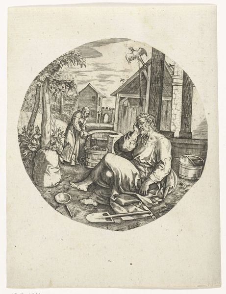 Philips Galle made this engraving, "Heilige Hieronymus," in the late 16th century. It depicts Saint Jerome, a key figure in the history of the Catholic Church, known for translating the Bible into Latin. The image, produced in the Netherlands, reflects the cultural and religious context of the time. Jerome, a gaunt figure, sits at his desk with a skull, a symbol of mortality, while a lion rests peacefully beside him. This juxtaposition creates a powerful visual statement. The lion is included because, according to legend, Jerome removed a thorn from a lion's paw, and the animal remained his loyal companion thereafter. Galle's print would have been part of a larger market for devotional images. By studying the engraving’s visual elements, and understanding the social and religious environment in which it was made, we can appreciate the role of art in shaping cultural values and beliefs. Investigating the production and distribution of prints in the Netherlands during this time would give further insight.