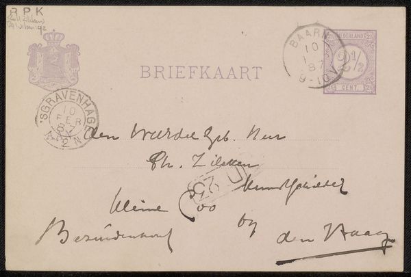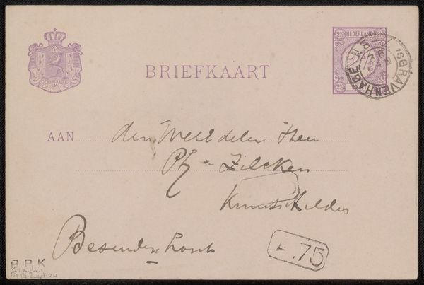 Curator: Let's turn our attention to this "Briefkaart aan Philip Zilcken" – a mixed-media artwork crafted before 1888. It’s a fascinating piece, currently housed in the Rijksmuseum. Editor: It has a delicate appearance. The light purple ink against the paper creates a very subdued tonal palette. I notice the emphasis on line – look at the careful loops in the penmanship! Curator: Indeed. And those script choices aren’t arbitrary; handwriting, particularly in correspondence like this, conveys nuances of social standing and intimacy. Note also the stamp with the postmark. It speaks to the infrastructure of communication at the time and the way it enabled intellectual exchange across distances. The artwork’s form – the letter itself – represents this complex network. Editor: You're right to point that out, the marks that the letter made as it physically moved through space, adding texture and additional, accidental, layers of meaning. Structurally, the stamp and crest serve as anchor points, framing the message and leading your eye around. Curator: The very act of sending a "briefkaart," rather than another form of correspondence, highlights socioeconomic dimensions; it suggests practicality, perhaps a certain urgency, maybe it even challenges rigid social norms by opting for simplicity over ostentation. It becomes a subtle form of resistance, wouldn't you agree? Editor: A rebellion of form, perhaps. It makes me think of the sparseness of early minimalist art – using very little to achieve resonance through structure and reduction. Curator: Considering it's addressed to Philip Zilcken, it probably circulated within artistic and intellectual circles. It reminds us that art doesn't exist in a vacuum; its meaning is made by the discourses surrounding it, in those who engage with it, and the locations it inhabits. Editor: That's the nature of art itself, though. Whether a drawing, graphic work, print, collage, or a common piece of correspondence, its inherent structural properties draw our attention. From those basic elements, meaning blossoms. I feel so invited by the calligraphic script itself. It promises hidden content ready to be found just beneath the surface. Curator: Looking at this "Briefkaart," reminds me of art’s ability to freeze a moment in time, capturing social exchanges that history tends to forget. Editor: Absolutely, this micro-history of intimate inscription is now out there, ready to make anyone ponder it, no matter who they are.