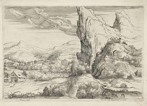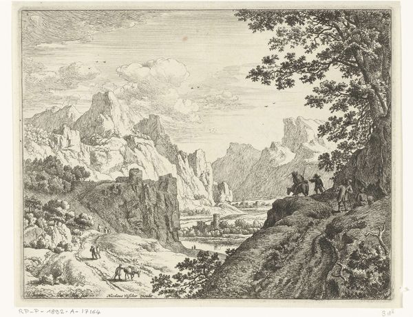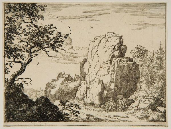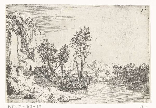 Anthonie Waterloo created this print, "Landschap met een steil pad", using etching techniques. The eye is immediately drawn to the rugged, vertical rock formation that dominates the composition. Its rough texture is achieved through dense, chaotic lines, contrasting with the smoother, more serene rendering of the distant landscape. Waterloo's use of line is particularly striking here. Short, broken strokes define the foreground vegetation, creating a sense of depth and tactile realism. This contrast between foreground and background speaks to a broader artistic concern of the time: the relationship between the particular and the universal. Is Waterloo inviting us to reflect on our place within this grand landscape? The figures at the bottom of the image certainly suggest so. Ultimately, this print is an invitation to contemplate the interplay between nature's imposing grandeur and the human experience.