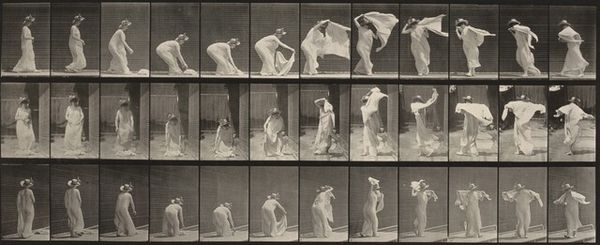 Editor: This is "Plate Number 221. Stooping and lifting a 12-lb. basket to head" by Eadweard Muybridge, a gelatin silver print from 1887. I'm immediately struck by the repetition of the figure and how clinical it feels. What stands out to you, and how do you interpret this work? Curator: What I see is a stark exploration of labor, gender, and scientific observation. The repetitive nature reduces the female figure to a mere object of study, devoid of individuality. Consider the social context of the late 19th century – what does it mean to repeatedly show a nude woman performing labor like this, in a scientific context? How might this reflect societal views of women and work? Editor: I hadn't really thought about the context beyond the science aspect. Was Muybridge aware of these social implications? Curator: Whether Muybridge consciously intended it or not, this work becomes part of a larger discourse on the objectification of women. The clinical presentation further reinforces this idea. We must also consider the colonial gaze inherent in such projects, examining whose bodies are studied and by whom. Editor: It makes you wonder about the model and her agency. She’s part of a scientific process, but also vulnerable. Curator: Precisely. Whose narrative is being prioritized here? It forces us to critically examine the power dynamics at play. It isn’t just about documenting motion; it’s about who gets to do the documenting, and whose bodies are put on display, and for what purposes. Editor: This makes me reconsider how I viewed Muybridge's work. It's not just science, but a commentary on society at the time. Curator: Absolutely. By engaging with feminist theory and cultural studies, we unveil the layers of meaning embedded within seemingly objective representations of the body. That changes the way you see art, doesn't it?