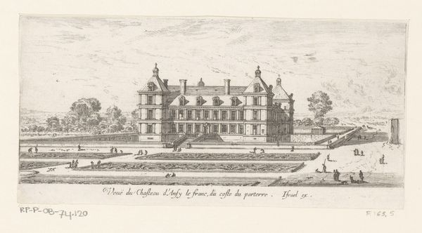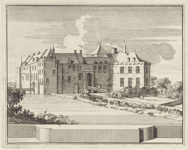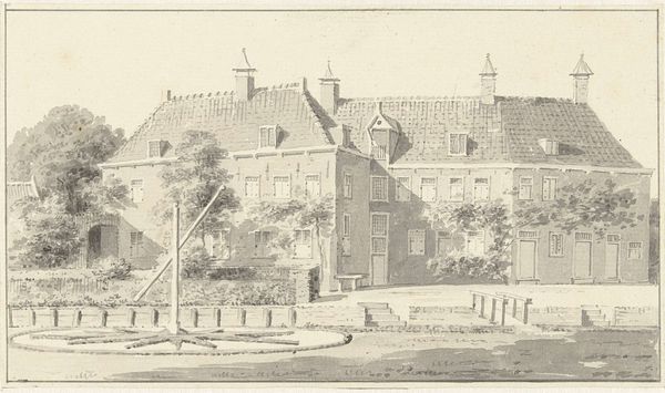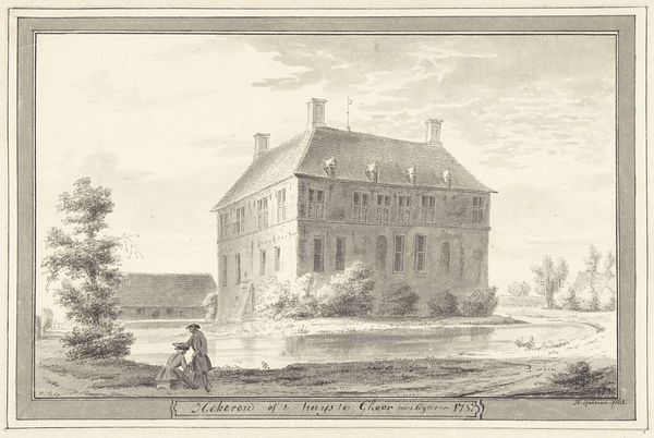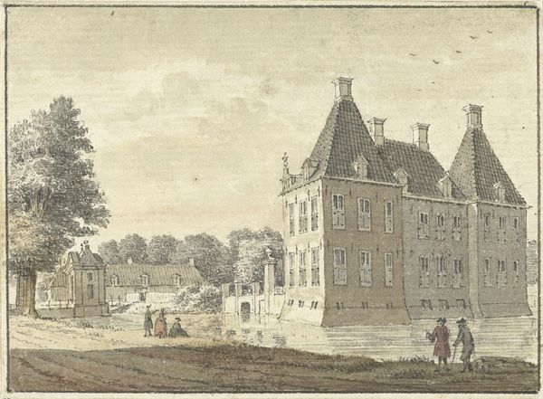 Editor: This watercolor painting from 1737 by Jan de Beijer, titled "Het kasteel te Anholtz," depicts a very picturesque castle. There's such a sense of order and tranquility in the symmetrical layout. What do you see when you look at this piece? Curator: What immediately strikes me is not just the order, but also the carefully constructed portrayal of power and privilege inherent in such landscapes during the Baroque period. Consider how the artist situates the castle, literally and figuratively, at the center of everything. Who benefits from that? Editor: Well, presumably the owner of the castle…and maybe the artist, too? Curator: Exactly, and what does this idealized depiction erase? Think about the labor required to maintain such a grand estate, the socio-economic structures that allowed for such extravagance in a time of stark inequalities. Where are the markers of the dispossessed or exploited? How do these idyllic scenes legitimize the existing power structures? Editor: I hadn't considered the power dynamics so explicitly. I guess I was just appreciating the pretty scenery. Curator: Precisely! That's the seductive power of such art. It invites us into a seemingly harmless scene, while subtly reinforcing a particular worldview. What do you make of the inclusion of figures like servants or laborers at the edge of the painting? What's their relationship to the central figures in the foreground and the owner inside the Castle? Editor: They are relegated to the margins...almost invisible. So, even in what seems like a harmless landscape painting, we're seeing a reflection of social hierarchy. Curator: Indeed. By acknowledging the painting’s complicity in power structures of the time, we begin to unravel its layers of meaning, even its potential biases. Editor: I'll never look at a landscape painting the same way again! Thank you! Curator: My pleasure! Art challenges us to question the narratives we inherit. And this piece has plenty to unpack.