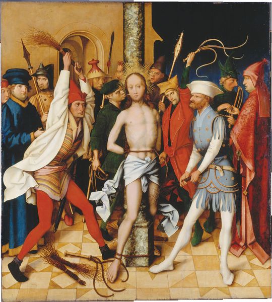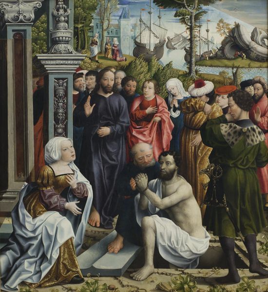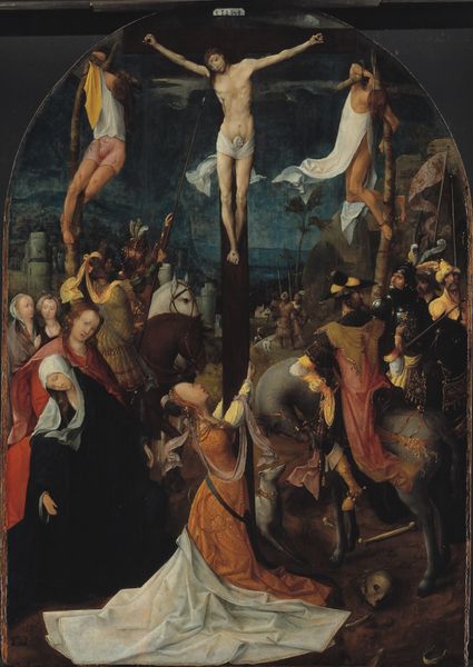 Editor: Here we have a detail of the "Altar triptych from the Lubeck Cathedral," crafted by Hans Memling around 1491. The dramatic tension in the painting really strikes me. With the figures in turmoil below the crosses. What do you see as the most significant formal aspects of this composition? Curator: Primarily, it's essential to analyze the carefully constructed visual space. Observe how Memling employs vertical lines of the crosses, anchoring the composition and dividing the scenes. Do you note the use of color in relation to those vertical divisions? Editor: I do. The brighter colors seem clustered at the base, almost fighting for space, drawing our eye downwards, perhaps toward that scattering of bones near the bottom of the frame. It feels unbalanced somehow. Curator: Precisely. That tension arises from the disjunction between the linear organization of the crosses and the more chaotic arrangement of figures. Consider the artist's decision to populate the ground plane so densely. What purpose does that serve, visually? Editor: To heighten that sense of claustrophobia and emotional intensity perhaps? All that emotion contained between those stark, vertical crosses… I also notice the shift in focus from detailed foreground figures to the atmospheric perspective used to create a vast background, that extends almost to the sky. How does the interplay between these elements impact the painting’s message? Curator: That contrast generates depth, while that sky pulls away. This layering of form complicates a direct reading, forcing a slower engagement with the formal relationships. We have to remember it’s a triptych: not everything is designed to meet in a single place, within this section alone. Editor: I hadn’t thought of it that way. It is all about those inter-panel relationships after all, how meaning shifts across those separations! Thanks, that was insightful.