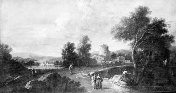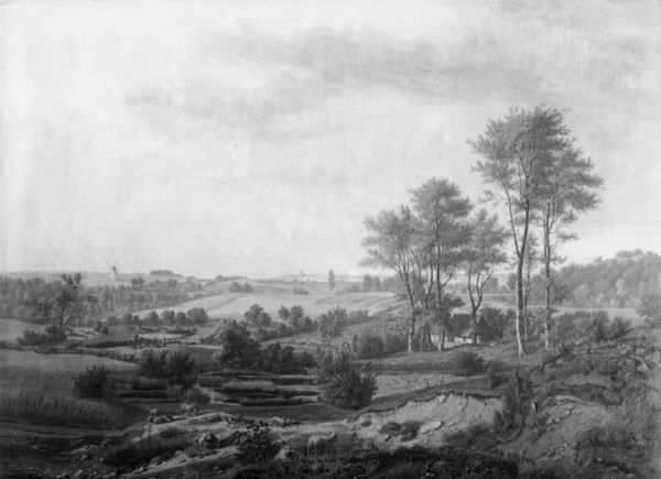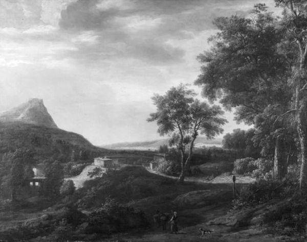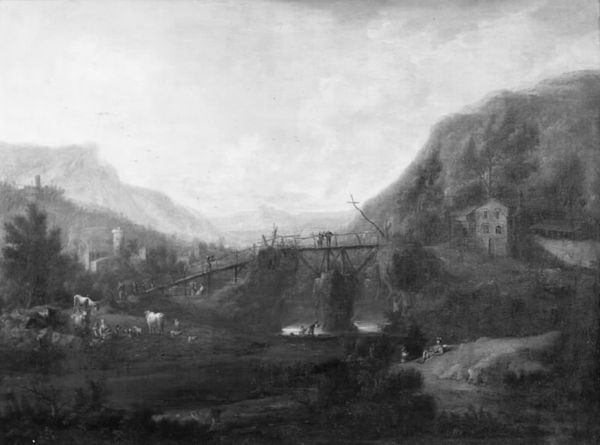 Curator: It's striking how a monochrome palette can still evoke such depth of emotion. Editor: Absolutely. At first glance, it feels bleak, almost desolate. What can you tell me about Johann Salomon Wahl’s "Flodlandskab," made sometime between 1704 and 1765? Curator: Wahl's landscapes are often rooted in a close observation of nature but filtered through the aesthetic lens of the baroque. Note how he uses stark contrast between light and shadow. That interplay creates visual drama but also guides the viewer's eye through the composition. The dark foreground pushes us toward the lighter, distant vista. Editor: The figures populating this "Flodlandskab," some on horseback, others seemingly engaged in labor—they feel less like subjects and more like symbolic markers of societal hierarchy within this landscape. The painting, to me, feels like it comments on land use and the relationship between people and environment during the 18th century. It's easy to get caught up in aesthetics and not remember there are complicated power structures within that frame. Curator: That's an excellent point. Landscape, especially in the baroque, wasn't just about pretty scenery. The images and narratives were often interwoven with themes of possession, dominion, even divine right. What looks natural is deeply coded. And of course, color itself can be highly symbolic but that is not obvious here given that is in black and white, or monotone style. Editor: Even the very idea of landscape, framing it as something aesthetically pleasing – who gets to define that beauty, who gets to access it, and at what cost? Are those houses in the distance peasant dwellings or the homes of wealthy landowners surveying their holdings? Curator: Those are critical questions to consider when viewing paintings like these. Thinking of land as property certainly gained traction during the baroque era. Perhaps seeing it this way, as you noted before, adds to the bleakness. Editor: It definitely changes the way I see the painting. Knowing these visual elements have historical roots pushes me to question the narratives promoted in our culture. This image prompts discussions about what it meant to live during the artist's time and encourages a reevaluation of those cultural values and ideologies. Curator: For me, this piece creates continuity to landscape paintings across centuries. Wahl, perhaps unintentionally, touches upon a struggle between human agency and the enduring, timeless power of nature.