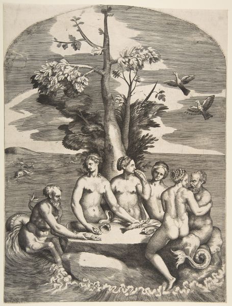 Giorgio Ghisi created this engraving, *Danae and the infant Perseus cast out to sea by Acrisius*, around 1555. The stark contrast between light and shadow immediately draws our eye to the figures of Danae and Perseus, underscoring their vulnerability. Ghisi masterfully uses line and form to convey both narrative and emotion. The receding lines of the boat create depth, while the turbulent lines depicting water and foliage contribute to a sense of unease. Note the stoic resignation on Danae's face as she sits, head in hand, in contrast to Acrisius’s purposeful stance as he casts them off. Structurally, the composition is divided, separating Danae and Perseus from Acrisius. This division represents not just physical distance but also moral and emotional separation. Consider how this calculated arrangement of figures and lines creates a scene ripe with tension and pathos, inviting contemplation on themes of fate, injustice, and resilience.
