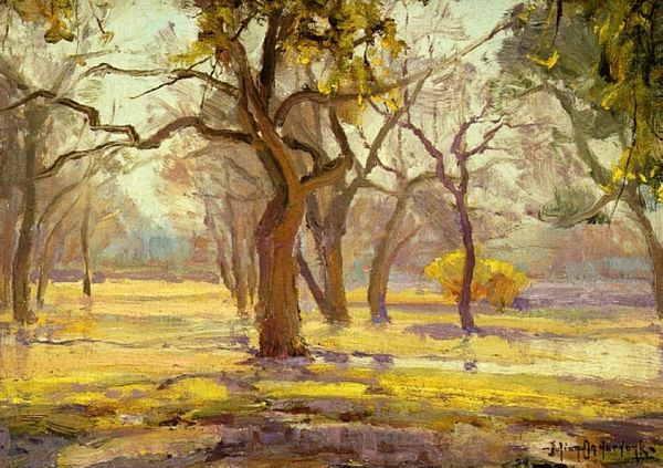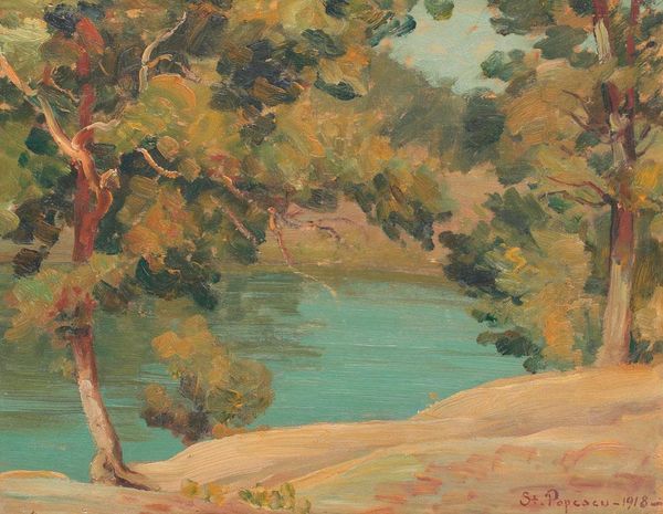 Curator: Ah, a peaceful vista. What are your initial thoughts about this artwork titled, "At the Shadow of Walnut Trees", an oil painting by Stefan Popescu? Editor: There's a definite calmness, isn't there? The palette is very muted, almost monochromatic with its ochre hues, and the textures feel soft, despite the visible brushstrokes. Curator: Indeed. The painting exhibits characteristics of both realism and post-impressionism with its focus on capturing light and form with such tangible plein-air application of paint. Let’s focus on its structure: How does the artist employ elements to guide the viewer? Editor: Well, your eye is led primarily by the lines formed between the stacks and then upward into the shade provided by the titular Walnut trees. These are arranged so densely at the top. There is an element of light coming through too, especially in that center apex with the small light area that has a clear negative impact on how one appreciates the shade. This is enhanced by darker and warmer pigments used. Curator: The composition establishes a hierarchy, subordinating elements towards a central motif. Do you notice how Popescu created almost separate spatial realms? What of his visible, tangible strokes? Editor: They hint at a painterly style indicative of post-impressionist techniques. Popescu seems less concerned with precise mimetic representation, in favor of conveying an emotive sense of place. Think about where he was coming from; What does the socio-political environment dictate as to how we view or respond to art? Is it purely meant as an aesthetic of place and beauty? Curator: We understand these representations in response to our cultural experiences; but here it might also emphasize the individuality and subjectivity inherent in perceiving the landscape, rather than focusing merely on objective representation. Do the trees here function as something like metaphors? Editor: It’s interesting to reflect how these visual markers impact society at large, to reflect on how galleries dictate taste... Anyway, it reminds one of our connection to natural spaces... it invites pause. Perhaps the artist wanted people to stop, appreciate beauty... even at a shadow. Curator: Very nicely observed. Thank you for expanding my view with a greater sense of cultural context. Editor: A great painting opens infinite points, doesn't it? Thank you for focusing me back on how all the points meet.