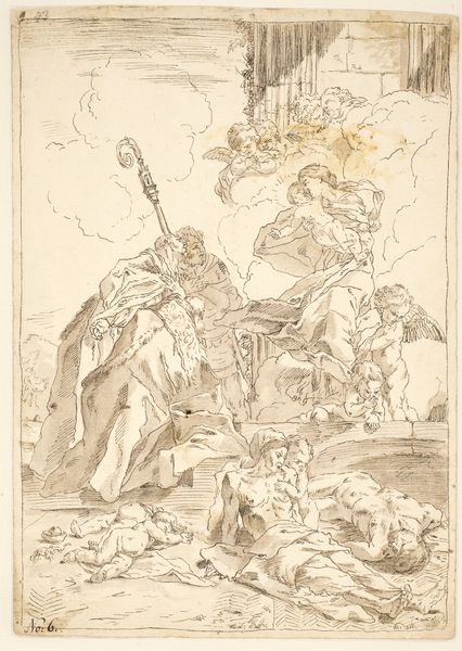 This drawing presents three Lucchese saints beseeching the Virgin Mary to aid plague victims. The saints Nicholas of Tolentino and Nicholas of Bari, identifiable by their ecclesiastical garb, stand as solemn intercessors. Note the repetition of the figure of the intercessor across cultures: one hand raised in supplication, a posture echoing ancient Roman orators and deities alike. This gesture, laden with hope and desperation, transcends epochs, resurfacing in countless votive images from antiquity to the present. The motif of plague saints intervening before the Virgin isn’t static; it’s a palimpsest. The collective dread of pestilence, etched into the cultural psyche, finds new expression with each outbreak, each rendition of this scene, and echoes in our own subconscious fears. The emotional resonance of suffering, mediated through saints, is a recurring theme, ever adapting in the face of human vulnerability.