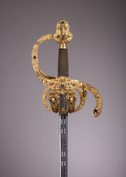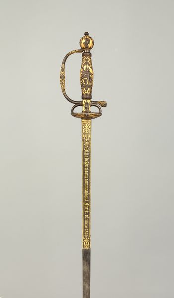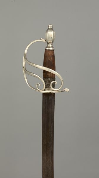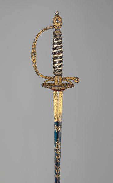 This Smallsword was created by Aubry Le Jeune, likely around the late 18th century. Immediately striking is the contrast between the blade's sleek, linear form and the hilt's ornate embellishments. The handle, wrapped tightly with what appears to be woven metal, offers a tactile invitation, juxtaposed against the cold, smooth steel of the blade. Consider how this interplay embodies the duality of power and status. The blade, a tool of lethal precision, is visually balanced by the handle and guard, which are adorned with intricate designs in gold. The balance of the weapon suggests a semiotic code where beauty enhances power. It is a status symbol as much as a functional weapon. Note the curve of the guard, mirroring the arc of a dancer’s arm, almost inviting one to consider the performative aspects of wielding such an object. The Smallsword isn't just a weapon; it’s a statement, encapsulating the grace, power, and intricate social rituals of its time. It speaks of a world where form and function are entwined in a deadly dance.