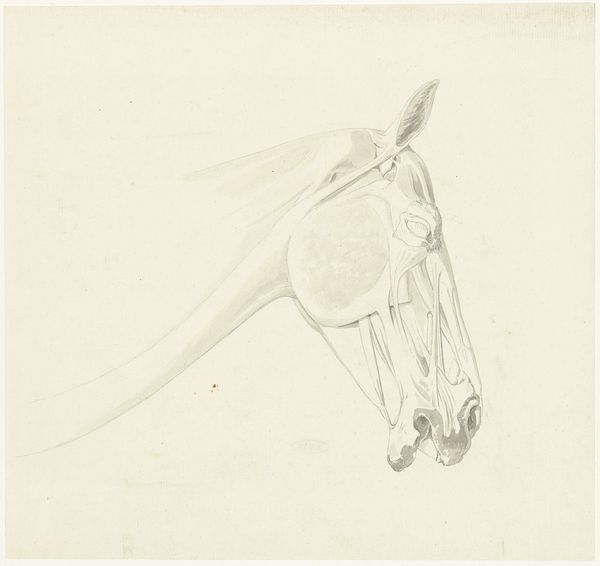 This is Johannes Tavenraat's drawing, “Paardenkop, naar rechts”, made with graphite on paper. The subdued palette accentuates the form and detail of the horse’s head. Notice how the lines and shading create a compelling sense of depth, focusing our attention on the animal’s anatomy and its bridled tension. Tavenraat masterfully uses line and shadow to convey the texture of the horse’s coat and the tautness of its skin. The composition, cropped tightly around the subject, enhances the immediacy and intimacy of the portrait. This close framing prompts us to consider the power dynamics inherent in the representation of animals, particularly their domestication and use by humans. The formal precision and careful attention to detail invite a reflection on the relationship between art, nature, and control. Consider how the artist’s focus on form elevates a simple sketch to a study of structure. It is an investigation into the underlying architecture of living beings and the ways we perceive and categorize the natural world.