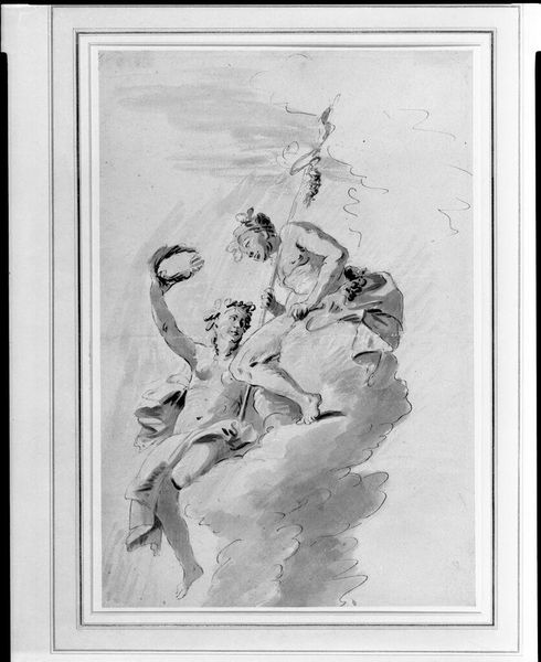 Curator: This is Honoré Daumier’s lithograph, "Vulcan's Net," housed here at the Harvard Art Museums. Editor: It's remarkable how Daumier captures the messy reality of relationships. The scene feels almost voyeuristic. Curator: Daumier frequently used classical mythology to critique contemporary French society. Here, we see Vulcan trapping his wife Venus and Mars in a net for their adultery. The hammer to the left is Vulcan’s and signifies his social position as the blacksmith. Editor: The net itself becomes a powerful symbol. It represents not just physical entrapment, but also the social constraints imposed upon women and the ridicule they face. The classical setting seems to mock modern norms. Curator: Absolutely, the setting adds a layer of timelessness to the critique, showing how societal issues persist across eras. It’s a shame that Daumier’s political convictions led to imprisonment, even though his art provided crucial social commentary. Editor: Seeing the enduring resonance of symbols like the net makes one consider how we ourselves participate in upholding cultural memory.