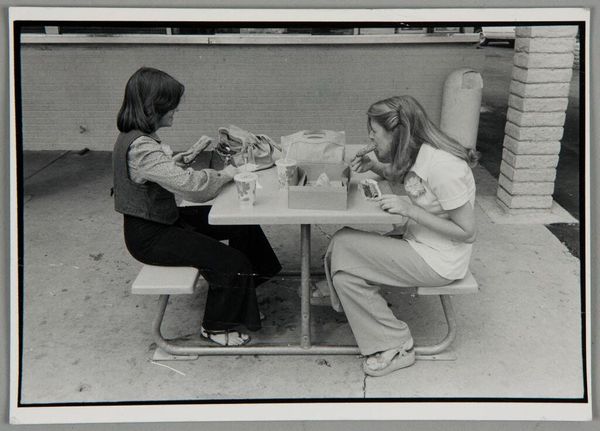 Curator: Bill Dane captured this photograph, titled "Untitled (S. F. Ferry)." It’s a black and white image of two people sitting on a bench, seemingly on a ferry. Editor: It feels like a fleeting moment, a slice of everyday life caught on camera. The starkness adds to a sense of quiet observation. Curator: Exactly, the bench itself becomes symbolic, doesn't it? The text "Life Preservers" adds a layer of meaning—safety, survival in transit, both literal and perhaps metaphorical. Editor: I’m struck by the social dynamics, though. The subjects are close, but distant. Is it generational? Are they mother and daughter? What's being communicated in their body language, their averted eyes? Curator: Absolutely. Dane invites us to project our own interpretations onto this ordinary scene. These figures become vessels for our own memories and associations of travel. Editor: It makes you wonder about the unspoken narratives happening all around us, those momentary connections and disconnections in shared spaces. Curator: A profound meditation on anonymity and intimacy, wouldn’t you say? Editor: It does make you think about how we can build sociality in public spaces.