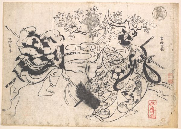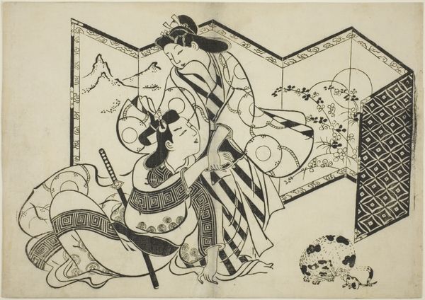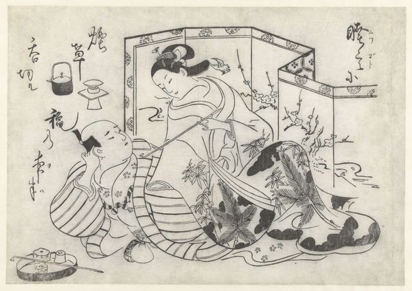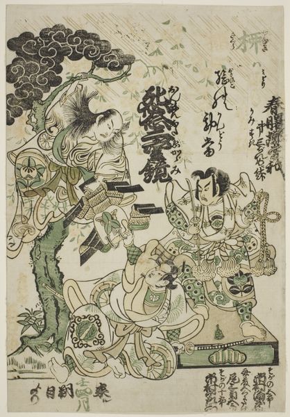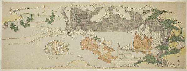 Editor: Okumura Masanobu's woodblock print, "The Crossing of the Tanabata Boat," created around 1715, shows three figures in a boat. It feels quite dreamlike, maybe even melancholic, given the muted tones. How would you interpret the scene? Curator: It’s interesting to see how Masanobu visualizes the Tanabata legend here. Remember, Ukiyo-e prints like this were not just art, they were popular culture. Consider how this print, and its dissemination, helped to shape the *public understanding* of this romantic myth in 18th century Japan. What do you notice about the depiction of the women themselves? Editor: They're elegantly dressed and seem focused on scholarly activities. One is writing, another reading, the third maybe poling the boat? There’s a lot of emphasis on literacy here. Curator: Exactly. This elevates the female figures beyond mere romantic figures in a tale of love. It links them to ideals of education and refined leisure, aspirations perhaps, for the merchant class buying these prints. What do you think this suggests about the intended audience of this piece and its reception? Editor: So, the image speaks not just of the Tanabata myth itself, but to the cultural aspirations of its consumers and how art creates aspiration? Curator: Precisely! The intersection of romantic mythology, literacy, and socio-economic aspirations—all framed by the commercial context of ukiyo-e. That’s how a historian might read this deceptively simple print. Editor: That completely shifts how I view it. Now it seems like so much more than just an illustration of a folktale. Thank you!