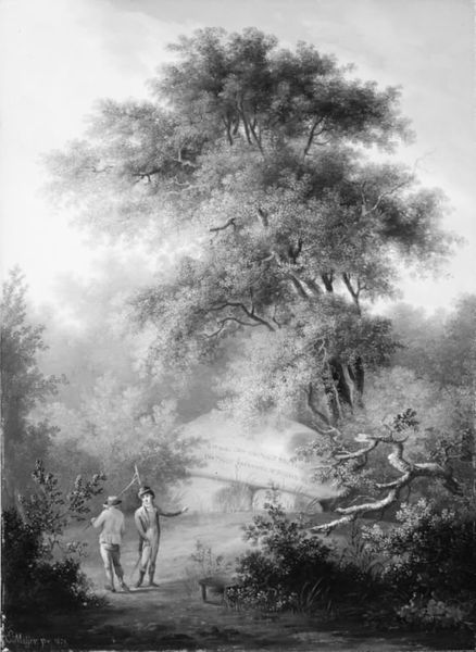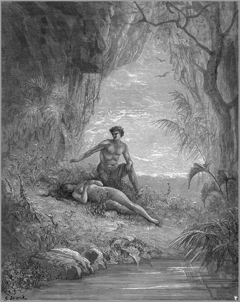 Curator: Gustave Doré’s engraving, “So parted they…the Angel up to Heaven From the thick shade, and Adam to his bower,” presents quite a poignant moment, wouldn’t you agree? Editor: It’s strikingly melancholic. The light seems to drain away with the departing angel, leaving Adam and Eve in almost desolate shadows. It's dramatic! Curator: The stark black and white emphasizes the sense of loss and the shift in their world. Consider the Victorian era's fascination with Milton's Paradise Lost. Doré's commercial illustrations, mass-produced as engravings, made high art accessible. Editor: The details in the engraving are mind-blowing, given it's all lines, no colors at all! Did he do this freehand, or did they have some other methods? I am thinking that a tool and a surface were used, along with his mastery, to reach this kind of outcome. The tonal range feels so expressive... like a whispered secret. Curator: The cross-hatching technique would’ve demanded meticulous labor. Doré understood the marketplace: an artistic commodity for middle-class consumption. We cannot separate its artistry from its industrialized origins. Editor: Okay, but setting that aside, isn't there something heartrending about their postures? The way Adam seems to be shielding Eve. What is she feeling here? Curator: Certainly, Doré captured their vulnerability after the expulsion. Their nakedness underscores that sense of exposure and the social expectations of modesty at the time of production and consumption. Editor: Absolutely. Maybe this engraving taps into that lingering awareness we have as humans - how society always wants you to dress, to do, to be... Maybe these engravings were subversive reminders that there could have been a before to this time. Curator: A moment of utopian speculation embedded within industrial production. How curious! Editor: Yes, it is like we are now spectators, but what exactly are we watching? Curator: Well, this reflection reminds me that our engagement with an image reshapes its meaning. Doré's engraving becomes, itself, a commodity through interpretation, which I believe only makes its afterlife richer.