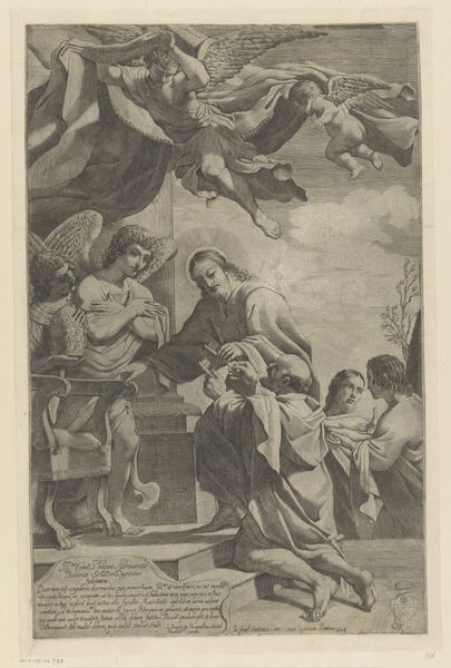 Editor: This engraving, "A Male Saint Kneeling Before the Christ Child," is an anonymous piece from around 1670 to 1731. There's a saint kneeling with a book, while a swarm of cherubic figures and clouds swirl above. What I find striking is the almost dreamlike quality—the saint seems completely immersed in a vision. How do you interpret this work? Curator: The symbolic density of this piece speaks volumes. The kneeling saint immediately conjures humility, piety. Notice how the Christ child isn't simply present, but actively engaging with the globe. Consider the globe: What could that placement on that image mean to someone in the 17th century? Editor: I'd imagine the globe represents earthly power and perhaps divine authority over it? Curator: Precisely. The artist, although unknown, taps into the Baroque era’s love of allegory. It’s more than just a religious scene. The surrounding putti, some playing musical instruments, point to celestial harmony. It implies the saint's devotion opens a portal to divine grace. Don’t you find the saint seems almost crushed by this vision of celestial activity? Editor: Absolutely, there’s an overwhelming sense of awe. Is it possible that the artist might be questioning that traditional view by presenting the experience as somewhat crushing? Curator: That's a very astute observation. This period was ripe with new philosophical perspectives on the Church's role and the role of faith. While the explicit meaning celebrates piety, these emotional ambiguities are definitely simmering below the surface. Editor: So, it’s a more complex visual statement than I initially thought, with layers of historical context and possible alternative readings woven into the symbolism. Curator: Exactly. The power of visual symbols lies in their enduring capacity to evoke a multitude of emotions and interpretations, reflecting both cultural norms and subtle critiques.