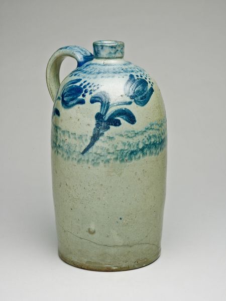 Editor: Standing here in front of "Vase," created in 1902 by Newcomb Pottery, crafted from ceramic and earthenware, I'm struck by the sense of tranquility it evokes. It reminds me of a quiet pond on a summer afternoon. The blues are so calming. What do you see in this piece? Curator: It whispers to me of twilight gardens and fireflies! The way those lotus blossoms and leaves are rendered—it's pure Art Nouveau poetry. Think about the Arts and Crafts movement brewing at the time. People were yearning for handcrafted beauty, pushing back against mass-produced… stuff. And this vase embodies that longing, doesn’t it? A unique, handcrafted object, imbued with a kind of spiritual connection to nature. Doesn't it feel like a bit of a dream itself, spun from clay and light? Editor: Absolutely, the dreamlike quality is undeniable. And the lotus motif... I guess they were pretty popular back then? Curator: More than popular, darling! Think of the lotus flower itself: emerging from murky waters to bloom in pristine beauty. It’s a symbol of purity, rebirth, enlightenment—a universal image that resonates across cultures. To me, its inclusion suggests a narrative about hope. It's about finding beauty even in difficult circumstances. This particular rendering makes it feel… American. There’s an almost folksy directness, wouldn't you agree? Editor: It does! I never thought of it that way. I was too caught up in just thinking it was a pretty vase. Curator: That's perfectly alright. A work of art doesn't demand our approval or understanding, it requests a moment of genuine presence in an experience. What will you do with it? Editor: It's inspiring to consider how cultural movements and symbolism intertwine. I'll try to remind myself to stay present, while considering a work’s story. Thanks! Curator: The pleasure was entirely mine, my dear! Never underestimate the power of a ‘pretty vase’ to hold a universe of stories.