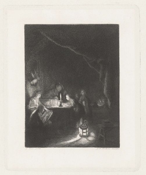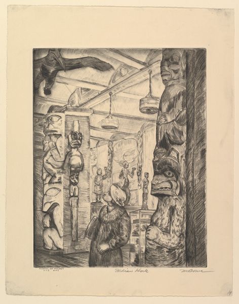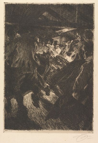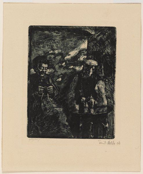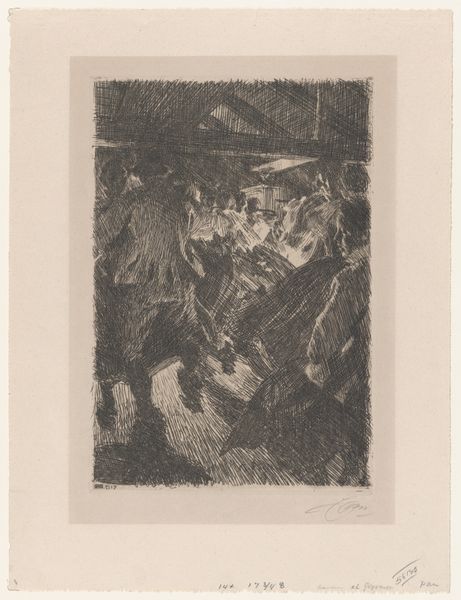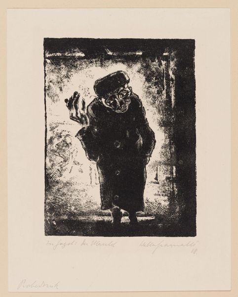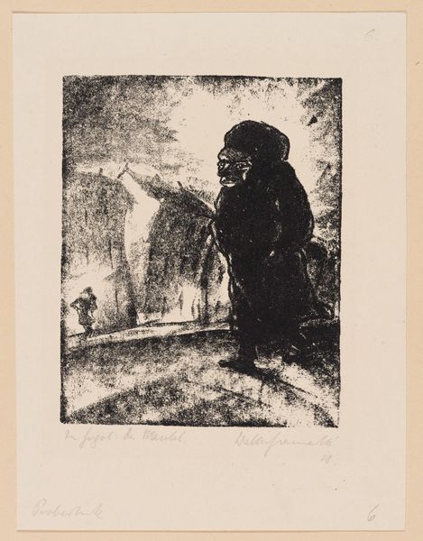 Editor: This is Walter Gramatté’s woodcut, "The Morning Way to the Office." It's a powerful, dark image. What kind of symbolic weight do you see in this procession? Curator: The figures, rendered almost as silhouettes, evoke a sense of anonymity and collective experience. Notice how the artist uses stark contrasts. What cultural memory does that visual language trigger for you? Editor: A feeling of oppression? Like cogs in a machine? Curator: Precisely. Gramatté's use of simplified forms and intense blacks resonates with the visual language of Expressionism, a movement deeply concerned with the psychological impact of modernity. Do you see how the repetition of figures creates a dehumanizing effect? Editor: Yes, the lack of individuality is striking. It makes you think about the loss of self. Curator: Exactly. The print becomes a potent symbol of alienation, echoing anxieties that continue to resonate today. It makes you consider the tension between individuality and conformity, doesn’t it? Editor: Absolutely. I hadn't considered its continued relevance so deeply. Thanks for opening my eyes.
