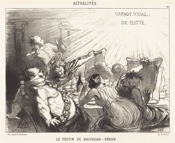 Curator: Looking at "Suites du macadamisage," a lithograph by Honoré Daumier from around the 19th century, one can't help but feel a certain sense of chaos. Editor: Absolutely. It's a whirlwind of lines! The texture alone conveys a feeling of unease, of imbalance. What do you see in the composition itself? Curator: Well, consider the symbolism first. Daumier's use of caricature is poignant. We have these exaggerated figures standing amid a streetscape overwhelmed with "For Rent" signs. The title, of course, refers to macadam, a type of paving, and hints at disruption. This reflects the rapid urbanization of Paris, and how these changes left landlords desperate, a kind of symbolic critique of societal shifts. Editor: I see it, yes. The composition, though, seems to amplify this anxiety. Note the receding perspective, pulling the eye back to those distant "A Louer" signs, suggesting an unending vista of financial trouble for property owners. Then there’s the lack of clear focal point, fragmenting the view into isolated pockets of frustration. Curator: Exactly. Those scattered signs do create an atmosphere of disorder. They signify loss and displacement in the cultural memory. One might read into those characters an emotional response. Are we seeing anger or merely dejection? Editor: Probably a blend of both! From a formal perspective, the stark contrast of black ink on white space increases tension. Light and shadow work to distort features, echoing that distortion in the social order Daumier depicts. The sketchy technique evokes a raw emotional response in us, I'd argue. Curator: Daumier understood the power of such visual shorthands. This print functions as both a document of its time and an enduring statement about social upheaval. Editor: I agree completely. "Suites du macadamisage" remains such a relevant composition due to the visual language, its texture of crisis and commentary that we still engage with today.