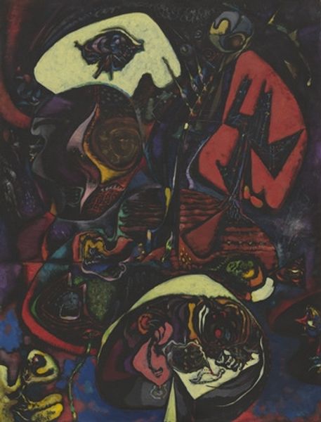Curator: Ah, yes. This mixed-media piece from Max Beckmann, done sometime between 1936 and 1947, entitled "Pandora's Box." It is such a compelling work! What do you think? Editor: Claustrophobic. Overwhelming. My first instinct is to look away, honestly. Like peering into a disturbed dream. Curator: Precisely! Beckmann manages to encapsulate so much with this one canvas—a dense layering of symbols that speak to anxieties about hidden darkness and unexpected consequences. You immediately feel the weight of the myth. Editor: I'm particularly drawn to the geometric shapes that feel so oppressive, circling and swirling like vultures. The cylinders with these eerie red centers recall inescapable eyes. And what’s behind Pandora's Box looks like a vortex! Curator: Very astute. Geometric shapes create an inescapable tension that contrasts with the chaos implied within the smoke and suggested turmoil pouring out from this literal "Pandora's Box". Beckmann was exploring figuration while working during a pretty troubled time in history, which feels strongly reflected in the image's emotional violence. The use of painting, drawing and ink is combined to communicate on multiple planes of experience. Editor: It's as though he’s externalizing internal turmoil, making the invisible visible, very much in the spirit of German Expressionism. Those sharp lines almost seem like fractured emotions given form, and all the cylinders and lines have trapped the hope which is, traditionally, all that remained after the box was open. Curator: Absolutely! It suggests that the human spirit's been wounded; hope may remain but is in constant distress. Notice also that "Pandora's Box" is very much an artistic rendering. One might argue that it seems more like an old movie projector than a box... the kind of mechanism we rely on to distort the truth for our own amusement. Editor: That is a powerful idea! Especially when you link it back to Beckmann’s anxieties, the notion that we are both captivated by and ultimately undone by these narratives and symbols makes me think more of this as an apocalyptic statement than merely an exploration of personal demons. It really invites contemplation, and perhaps catharsis, don’t you think? Curator: Agreed! Beckmann always makes me reconsider the shadows in myself, as well as those around me. It’s like staring directly into a difficult mirror that offers some uncomfortable yet truthful insights.
