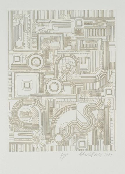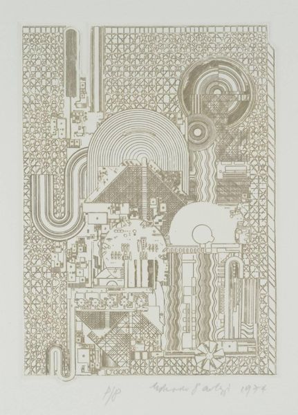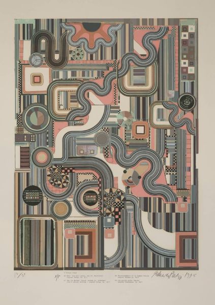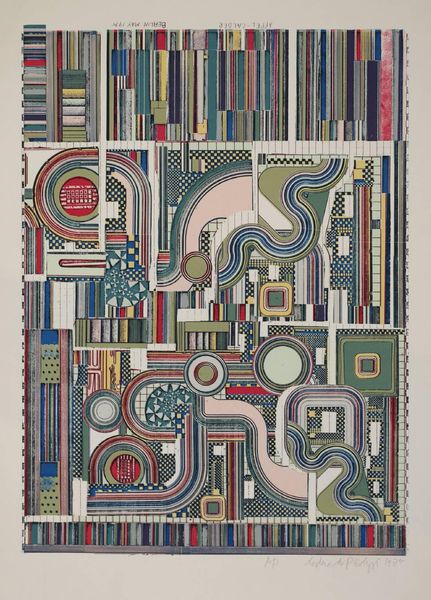 Curator: What a fascinating piece. This is "Ciao Picasso" by Sir Eduardo Paolozzi. Editor: It's certainly busy! My first thought is that it feels almost like a deconstructed machine, a celebration of mechanical forms in soft colors. Curator: Paolozzi, of course, was deeply engaged with post-war culture and the rise of technology. He was interested in how mass production and media influenced society. Editor: Absolutely. The title, "Ciao Picasso," suggests a playful farewell to traditional art forms, perhaps embracing the mechanical and the modern. You can really situate Paolozzi at the intersection of art, technology, and social change. Curator: It's difficult to ignore the presence of machinery motifs here. Editor: Yes, the mechanical forms suggest a fascination with technology. But the use of pastel colors softens the industrial feel, creating a strange tension. Curator: Indeed. Paolozzi uses this piece to almost comment on our post-war relationship with machine-age technologies. Editor: This has really highlighted the shift in artistic perspectives! Curator: For me as well! I find it thought-provoking.