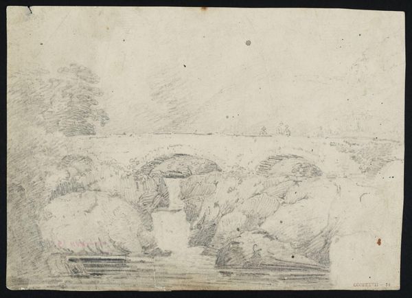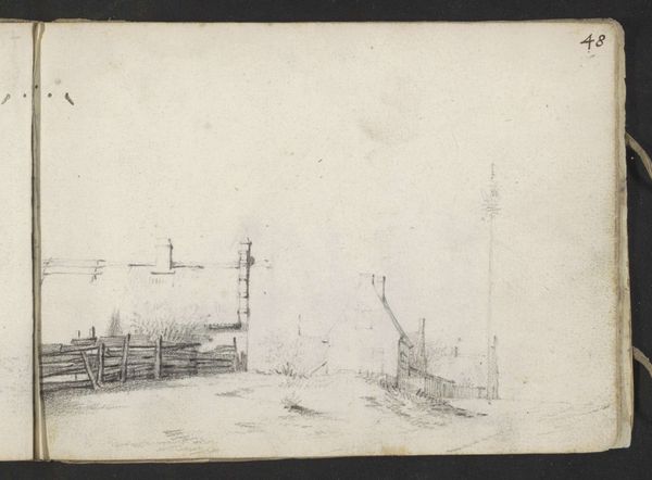 Curator: The stark simplicity of this sketch is captivating. Gerard ter Borch, around 1634, captured this "Sluis in een rivier"—a lock on a river—using ink on paper. Editor: There's a certain melancholic quality, isn’t there? The muted tones and rather still water…it feels very contained, even slightly oppressive. Curator: Indeed. Locks like this, while functional for trade and transportation, often became symbols of control—attempts to manage and tame the natural world. Borch, during the Dutch Golden Age, was likely commenting on the delicate balance between human intervention and nature's course. Editor: I see it, though I would argue he's highlighting human dependence on these structures. A sluice, in this region, would control flood, thus preserving lives and ways of life. Is it too much of a leap to connect that control to power and security within Dutch society? The drawing’s sparseness almost lends it the air of a political statement, of survival itself. Curator: Not a leap at all! The repeating sluice openings could suggest many successive societal strata depending on river water to maintain existence. Furthermore, notice how he places the viewer low, near the water. We're drawn into this sense of dependence, physically almost submerged within it. Editor: Which returns to the melancholic mood—the vulnerability this highlights! We feel so near and dependent on its mercy. Beyond that, how do you interpret the stark, almost severe lines of the architectural structure versus the softness of the water? Does that signify anything symbolic to you? Curator: It speaks to a dichotomy. Perhaps he's showcasing how society’s progress depends on restraining forces, but at a great cost. One is hard edged—linear, man-made—while the other reflects nature in her true chaotic, flowing form. I would say Borch captured much about humanity's place here. Editor: This little sketch becomes incredibly profound the more you sit with it. Thanks for taking the time. Curator: Absolutely. Considering it closely certainly amplifies both its social impact and emotional power.