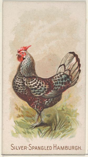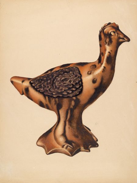 Curator: This delightful piece is entitled "Toy Bank: Rooster," created around 1937 by Beverly Chichester. It's rendered with colored pencils and drawing techniques. Editor: It has this darkly humorous folksy feeling—like something out of a vintage storybook, especially the way the pencil work creates textures of painted metal. Curator: Exactly. And let’s consider what’s being represented—a toy bank in the form of a rooster. The materials the original object might have been, probably tin or cast iron are interesting, right? Chichester highlights this manufactured aspect of folk art. Editor: Indeed. I’m struck by the somewhat unsettling yet captivating gaze the artist renders. The bold, dark lines accentuate the texture of the rooster’s feathers and bring such rich definition to the artwork's form. Curator: And the base, which appears to mimic wood. I see in this artwork the artist's perspective and social commentary on the everyday lives and consumer objects. The work emphasizes craftsmanship. Editor: But don't you feel it leans more towards caricature and an almost playful presentation, with those broad, simplified shapes. See how the tail feathers form a sort of closed sculptural volume and its balance with the chest. Curator: Perhaps, yet the social elements cannot be separated. Think about the object's utility: the saving habits and cultural relevance of toy banks at the time are intriguing too. Editor: That's a valid observation, but in terms of its impact, the simplified palette evokes very elemental earthy tones. Also note the balance that has been brought to this simple colour arrangement. This suggests this work focuses more on aesthetics of shape, and artistic intention more generally. Curator: Both aspects offer perspectives. By exploring these layers, we not only engage with a striking depiction but also gain some insights into the society from which it originates. Editor: Agreed, its brilliance truly comes from the seamless convergence of line, colour, and form, all interwoven within the artifice. The synthesis that generates the image’s presence in its context of artistic intent is powerful and effective.