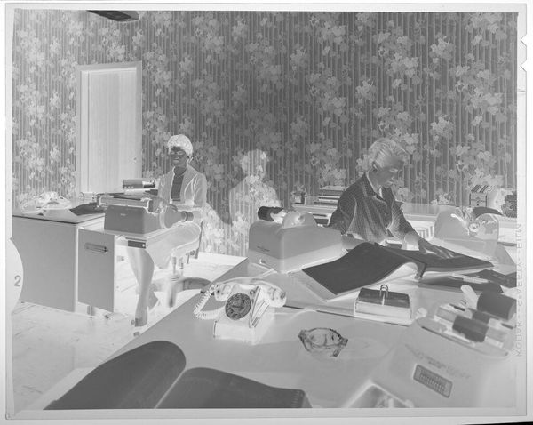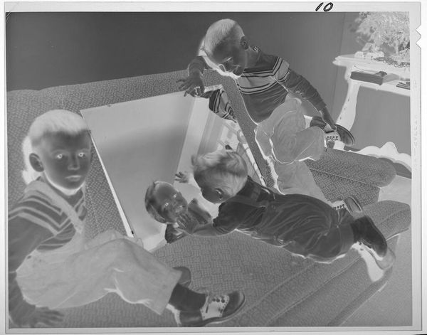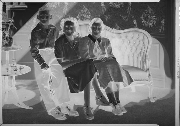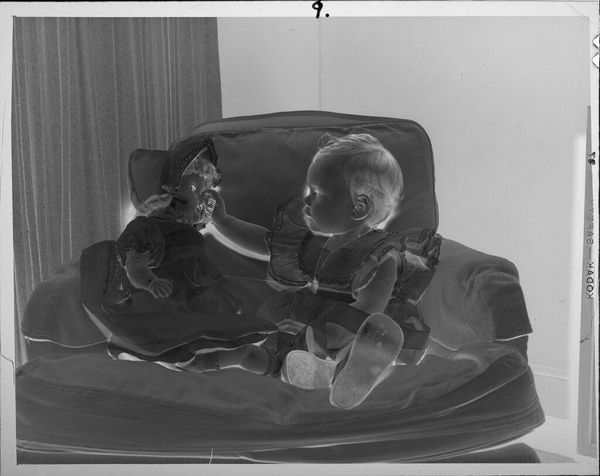 Editor: This photograph, "Untitled (girl on couch with dog)" by Lucian and Mary Brown, shows a girl with her dog on a couch. It has an eerie, dreamlike feel because of the reversed tones. What symbols do you think resonate in this image? Curator: The reversal, the negative space, it's a liminal visual space. The girl's gesture is one of care, and the dog, a symbol of loyalty, is vulnerable. Do you see how the photograph preserves a moment, a feeling, but in an altered way? Editor: Yes, it feels like a memory, slightly distorted. The innocence is still there, but the altered form changes the reading. Curator: Precisely. It asks us to consider the weight of representation, how even a simple scene carries emotional and cultural echoes. Editor: I see that now. Thanks, I hadn't considered the psychological impact of the photographic negative.