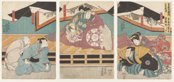 This woodblock print, "Scene from the Play The Mirror Mountain," was created by Utagawa Kunisada. The triptych unfolds as a sequence of carefully constructed spaces, each defined by distinct patterns and architectural elements. The figures, draped in elaborate kimonos, are positioned within these spaces, creating a dynamic interplay between form and pattern. Notice how Kunisada uses line and color to create a sense of depth and movement. The intricate patterns on the kimonos contrast with the flat planes of the backgrounds, drawing the eye in and creating a sense of visual tension. The asymmetry of the composition further enhances this tension, preventing the eye from settling on any single point. This deliberate destabilization of visual harmony is a key element of Kunisada's work. By disrupting traditional notions of beauty and order, he invites us to question the underlying structures of representation itself. The print challenges us to consider how meaning is created through the interplay of form, pattern, and space.