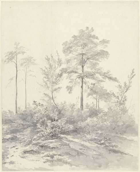 Editor: Here we have "Forest Landscape with Figures Along a Path," a drawing by Simon de Vlieger, made sometime between 1610 and 1653. The subdued tones and the delicate rendering of the foliage give it a peaceful, almost melancholic feel. How do you see this piece within its historical context? Curator: This landscape exemplifies a pivotal shift in the Golden Age. We're moving from overtly symbolic depictions of nature towards a naturalism deeply intertwined with national identity. The figures, almost lost in the immensity of the forest, speak to humanity’s relationship with the land. What do you notice about the composition itself? Editor: I see a strong emphasis on atmospheric perspective, the way the trees fade into the distance, creating a sense of depth. Curator: Precisely. This technique became popular as Dutch artists sought to capture the specific atmosphere of their landscape. Consider the sociopolitical implications – the independent Dutch Republic, having fought for its freedom, was eager to define itself, and the land played a crucial role in that definition. Can you see that reflected here? Editor: So, the very act of depicting the local landscape becomes a statement of national pride and identity? Curator: Absolutely. This drawing presents an idealized, almost romantic view, but it omits the realities of land reclamation, commerce, and even deforestation that shaped the Dutch landscape. What is *not* shown is just as significant. Editor: That's fascinating. I hadn't considered the potential political undertones within such a seemingly tranquil scene. Curator: It's a reminder that art, even seemingly straightforward landscapes, rarely exists in a vacuum. By understanding the forces that shaped its creation and reception, we can uncover its deeper meaning. Editor: This has definitely given me a new perspective on appreciating Golden Age landscapes. Thanks!