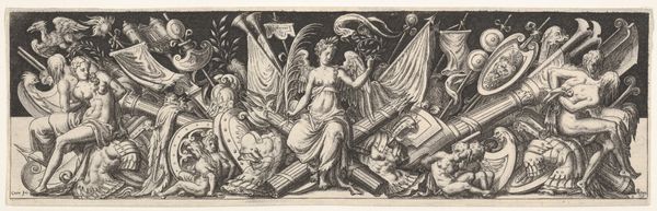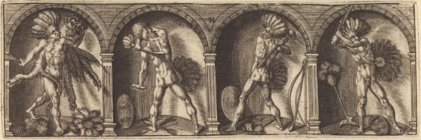 Curator: I'm immediately struck by the stark contrast—life and death frozen mid-motion, under these stately arches. There’s a real sense of theatrical dread! Editor: Indeed. This is "Houdingen van boogschutters in verschillende stadia van ontleding", dating roughly from 1610 to 1640. What we have here is a pen, ink, and etching work currently housed at the Rijksmuseum. Immediately, what stands out is the meticulous detail used to articulate both musculature and skeletal forms—all caught in different stages of decay. Curator: Memento mori, right? It's like a visual essay on the fleeting nature of existence, presented with this quirky… grace. Are those supposed to be *heads* the archers are using for… protection? Oh my. Editor: Precisely. Allegory is at play here. Note how each archer, whether fleshed or skeletal, holds a bow. There’s an element of Mannerism with elongated bodies and poses that strain against the picture plane. Curator: So it's the same figure, in various… states of being. Like life drawing, but, well, life and death drawing! I suppose there’s also something universal here – no matter how strong or skilled you are, death comes for everyone, and it turns you into… something else. I appreciate that this work offers beauty *and* starkness simultaneously. Editor: You’ve touched upon a core element—the duality. Formally, the etching presents a balanced composition, split neatly in quatrains each carefully positioned archer plays against their opposite in musculature vs bones. The detailed lines of the ink create textures highlighting sinew, bone and drape further adding to the sense of transition. It’s controlled decay, aestheticized even. Curator: Hmm. Controlled decay... I like that! Thinking about the time it was made— the 17th century wasn’t exactly a walk in the park. Maybe the artist was confronting some anxieties and turning them into art. Gives you a lot to think about... and maybe even face your fears. Editor: Absolutely. The artwork's careful detail, use of allegory, and skillful composition allows us, centuries later, to look beyond immediate dread and ponder these complex concepts with a blend of fascination and acceptance. Curator: Yeah, after this insightful walkthrough, I can say my first impression of dread morphed into, hmm... intellectual excitement and acceptance, too! It's really striking how a simple pen and some ink can have such an intense lasting impact, isn't it? Editor: Indeed. This piece underscores art's enduring power to probe life's most profound mysteries using the humblest means.