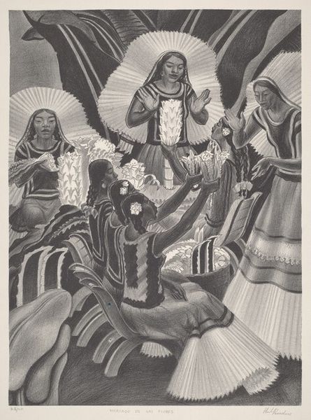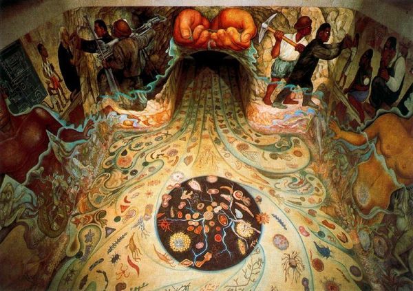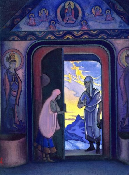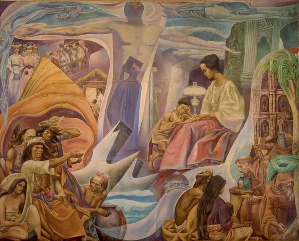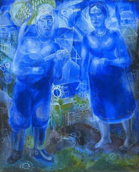 Curator: Kmetty János’s “Sermon on the Mount," created in 1918, is rendered in oil paint with visible brushstrokes, offering a very particular perspective on the iconic biblical scene. Editor: It's… surprisingly blue. And rather angular. The figures feel carved, almost, not really capturing any of the tenderness I associate with this scene. Instead, the heavy outlines draw the eye immediately to the sharp construction of forms and their stark arrangements. Curator: Well, look at the historical moment; 1918 was a year of intense upheaval. The expressionistic style amplifies the collective anxiety felt during the final stages of the First World War, and post-war social anxieties that permeated János' immediate social surroundings at the time, perhaps echoing the need for spiritual guidance amidst societal turmoil. Editor: That raw energy is undeniable. And yet, the layering of paint, the very substance of it, provides a sort of grounding presence. You see how he manipulates the impasto in the sky to mimic swirling clouds—it speaks to the laborious act of making something tangible from intangible emotions, don't you think? Curator: Precisely. The figures are also intentionally flattened, stripped of individual identity. The universal blue palette and stiff poses contribute to a feeling of shared, collective experience. It invites contemplation on class disparities and social status, perhaps suggesting a leveling effect achieved through shared suffering and collective longing for change in the social status. Editor: The making becomes a metaphor, then. Applying the materiality of paint in this fashion, János reminds us of the real work required for social change and spiritual awakening. Not just whispers of morality, but the gritty, demanding task of re-shaping reality, much like how we handle material. Curator: Right. And placing this event – the Sermon on the Mount - at such a critical juncture hints to a profound appeal for ethical transformation at a societal scale. It becomes less about passive spectatorship and more about actively constructing a more just reality. Editor: Exactly. It's about how these ordinary materials—paint, canvas, hope, and maybe faith—combine with deliberate human actions that change something monumental. I won’t view expressionist use of materials in the same way again. Curator: Indeed. Thank you, our material engagement allowed to uncover the nuanced layers within, offering, potentially, a re-evaluated perspective on a very canonical narrative.