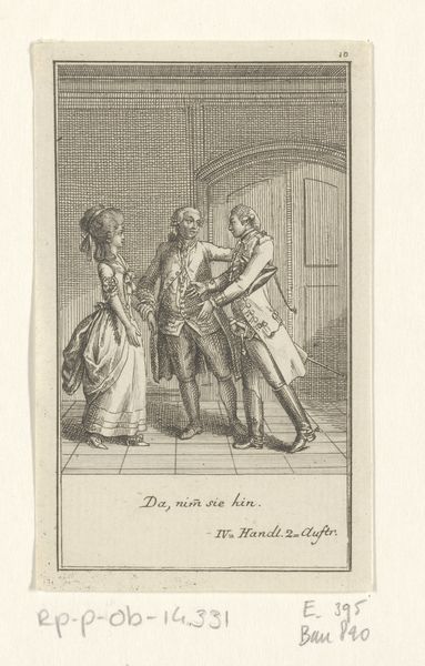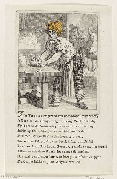 Curator: This is “Ruige Keet,” an engraving made around 1784 by Joannes Hulstkamp. As a print, it offered a wide circulation, typical of the time. What’s your initial reaction to it? Editor: Woah, it's like a Dutch comic strip! There’s such an exaggerated grimace on her face, and I find her tiny feet so incongruous. You just know something’s up with this "Ruige Keet". Curator: Precisely. This print engages with Dutch Golden Age traditions but with a Romantic sensibility, particularly around ideas of rebellion. Note the medium. It’s not just an artistic expression but a social artifact meant for widespread consumption and political commentary. Editor: So, the image is speaking to an immediate social issue? Tell me more. I mean, beyond her rather unique sense of style with those bright yellow bows… is that subversive? Curator: The print comes from a time of intense political unrest in the Netherlands. Figures like Ruige Keet were caricatured to sway public opinion during the Patriot revolution. Prints were distributed widely. Editor: So, this isn't just a picture; it's propaganda, visually attacking someone through readily available means. Knowing that gives those oversized slippers and sour expression a much harder edge, right? Curator: Indeed, it illustrates how art blurs into the social sphere, becoming a tool within the wider societal framework. Editor: So in this portrait, technique, satire, and social pressures coalesce into a pointed message. The labor and process of making such an easily distributed image seems like a strategic weapon of its time. Makes you think differently about art’s intentions and how it lives in the world. Curator: Precisely. Reflecting on this piece reminds me that artworks can operate within political and social realities. Editor: Right. Makes you wonder what kind of digital "prints" are being shared today, eh?