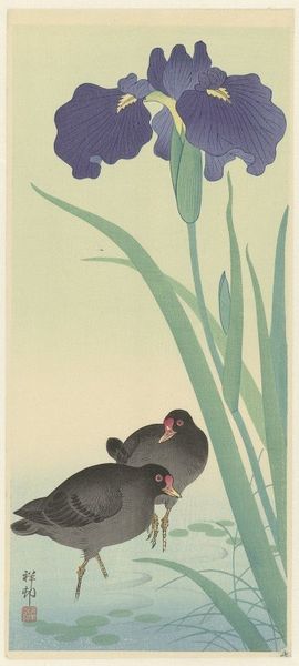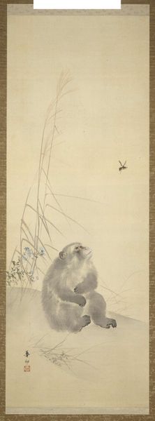 Curator: Ohara Koson’s “Monkey with Insect,” created sometime between 1900 and 1930, immediately strikes one as quietly captivating. Editor: There's something melancholic about it, actually. The muted tones, the monkey’s almost contemplative expression as it holds that insect… it speaks of impermanence. Curator: Yes, it's executed in woodblock print, a medium intimately tied to the traditions of Ukiyo-e. Looking at the textures and the fine lines depicting the fur and foliage, one appreciates the artisanal skill and labor that go into the production of these prints. Editor: The placement of the figure—a grey macaque set against wispy blades of grass—raises so many questions about the historical relationship between humans and nature. Is this a portrait of primate contemplation? Or does the insect symbolize something deeper about the natural hierarchy? Curator: Perhaps both! Koson was known for his kacho-e prints – images of birds and flowers – but this adds an unusual figuration. Consider the accessibility and consumer demand driving the market for such prints during that era; this piece exists within a nexus of commercial and artistic choices. The artist consciously employing traditional methods for mass appeal. Editor: I can't help but wonder how the print might resonate with audiences back then versus viewers today, as ideas surrounding colonial influence shifted drastically during the late Meiji and early Taisho periods in Japan. The gaze towards wildlife becomes less objective, tinged with romantic longing perhaps? Curator: Interesting thought. I’m curious, as an object made through careful processes, does our consumption of art allow room to appreciate labor conditions that formed it? Is such production ethically sound to modern audiences? Editor: I think situating it intersectionally encourages critical engagement. Looking closely we see so much historical entanglement that provokes meaningful present-day engagement. It's much more than simply decoration, no? Curator: Certainly not merely decoration. More like…a carefully constructed moment in time, reproduced to offer a slice of observation. Editor: Indeed, observation laden with implicit narrative—narrative about our relationships and perceptions constantly changing throughout time.