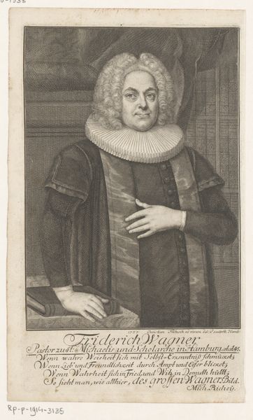 This is Christian Fritzsch's "Portret van Johann Bernhard Hassel," an engraving. The composition is dominated by Hassel's figure, rendered with meticulous detail through fine lines and cross-hatching. Note how the play of light and shadow defines the contours of his face and the folds of his garments, creating depth and volume. The texture, achieved through the engraving technique, adds a tactile quality to the portrait, inviting a close visual inspection. Consider how Fritzsch's technical skill elevates the subject, imbuing him with a sense of authority and intellectual weight. The formal elements of the artwork—the controlled lines, the balance of light and shadow, and the structured composition—serve not just as aesthetic devices but as cultural signifiers of status and knowledge. This work invites us to reflect on how portraiture can function as a form of cultural encoding.