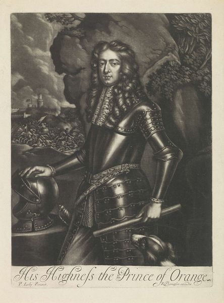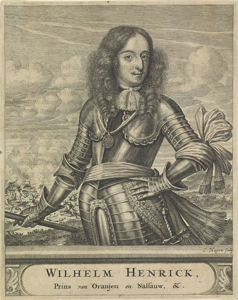 Jonas Suyderhoef's portrait of Willem III, Prince of Orange-Nassau, employs engraving to capture a regal yet youthful figure. The composition is bisected by the figure, whose polished armor reflects light, drawing our eye across the plate, while soft textures in the hair and the heavy curtain in the background add depth. Suyderhoef masterfully manipulates light and shadow to construct form and texture. The intricate lines of the engraving create sharp contrasts, defining the contours of Willem's face and armor. This play of light is not merely decorative; it serves to articulate the subject's status and character. Note the subtle battle scene in the lower left corner of the artwork. It serves as a reminder of the subject's power and influence within a highly structured, militaristic, and politically fraught society. The stark, linear quality of the engraving contributes to a sense of controlled dignity, befitting a future monarch. Suyderhoef's technical skill invites us to consider how art can function as both representation and cultural statement.