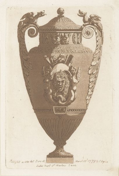 Patrick Begbie created this print of an antique vase with Minerva in 1779. The image reflects a growing interest in classical antiquity that shaped European art and taste during the 18th century. The vase itself is adorned with classical motifs - note the cameo of Minerva, the Roman goddess of wisdom and strategic warfare, flanked by mythical figures. This Neoclassical style, popular across Europe, was closely linked to the rise of museums. Works like this fueled a desire to classify and study antiquities, establishing a historical lineage for European culture. Engravings like Begbie's played a key role in disseminating these classical designs. They were collected by artists and artisans and served as source material for decorative arts. This print offers a glimpse into the cultural institutions and aesthetic values that shaped the late 18th century. To understand the role of artworks like this, we can consult period publications, museum records, and design manuals, piecing together the complex social life of images.