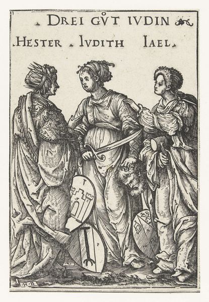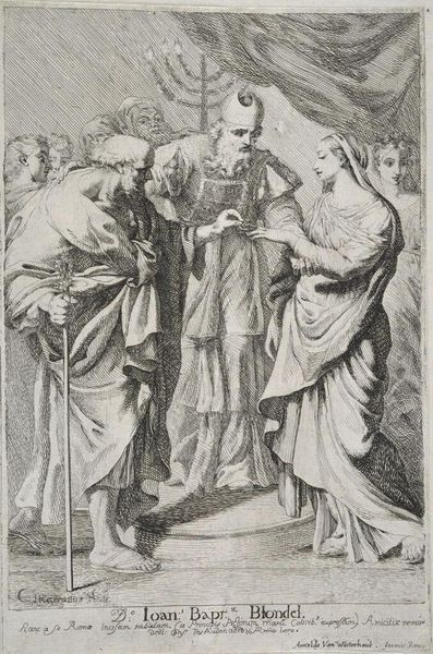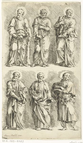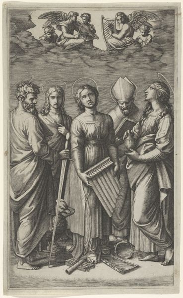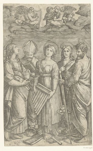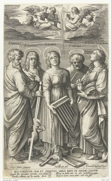 Nicolaes de Bruyn made this engraving, Heiligen Paulus, Johannes, Cecilia, Petrus en Maria Magdalena, in the Netherlands during the height of the Counter-Reformation. Looking at this piece through a contemporary lens, it's hard not to notice how it navigates the complex terrain of gendered and religious identities. Cecilia, the patron saint of music, stands centrally with her instrument, a symbol of harmony but also of her martyrdom. To her right, Mary Magdalene gazes upward, holding a chalice. Her positioning and gaze imply repentance but also the patriarchal framing of female spirituality as inherently tied to guilt and redemption. The male saints flanking them, Paul and Peter, stand as pillars of the early Church, their presence reinforcing the power structures of the time. The engraving embodies the era's attempt to reconcile classical ideals with Christian doctrine, using art to reinforce religious teachings and moral values. The piece subtly—and perhaps unconsciously—mirrors the societal tensions of its time, and reveals the artist’s participation in it.