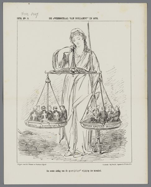 Curator: This lithograph, “Suffrage universel,” was created around 1850 by Honoré Daumier. The piece strikes me with its stark imbalance; the exaggerated figures crammed onto one side of the scale contrast sharply with the serene figure on the other. What's your take? Editor: It's striking, certainly. The composition relies on the dichotomy of weight and lightness, both physical and metaphorical. The lithographic medium allows for delicate shading which emphasizes the caricatured forms on the left while lending an almost classical air to the figure on the right. Curator: Absolutely. Daumier, known for his social and political commentary, made this print in response to the short-lived universal male suffrage granted after the 1848 revolution. Note how he represents the powerful, established interests as heavy and clinging to power, while the idea of universal suffrage, represented by a robed woman holding a vessel inscribed with the words “Suffrage Universel”, remains an ideal, separate from the chaos. Editor: Indeed, the use of symbolism is quite powerful. The vessel itself resembles an ancient amphora, perhaps alluding to the democratic ideals of classical antiquity. And observe how the chains supporting the scale on the left are straining, even appearing to break. There's an incredible tension embedded within the linework itself. Curator: That tension, I think, is key. It speaks volumes about the anxieties surrounding expanded voting rights during that era in France, doesn't it? The caricatures represent specific figures who actively attempted to obstruct or manipulate universal suffrage for their own gain. It's not simply a rendering of "the people"; it is about individuals struggling. Editor: The level of detail achieved with lithography is impressive. Daumier manages to convey individual character with a minimum of lines, each telling a story through posture and facial expression. It's this efficient use of form that gives the artwork its sharp edge. Curator: I agree. Ultimately, Daumier uses this print to scrutinize the political landscape and lay bare the competing interests vying for control. The fact that it still resonates today highlights the enduring relevance of his social critique. Editor: It does invite reflection. Even divorced from its historical context, the artwork operates as a fascinating study of balance, both in terms of composition and conceptual weight. The materiality enhances its impact, lending a physical presence to its otherwise abstract message.