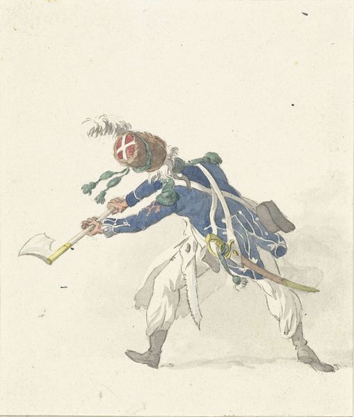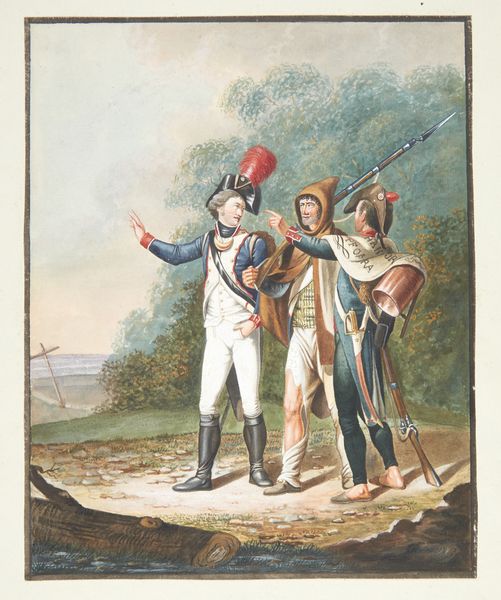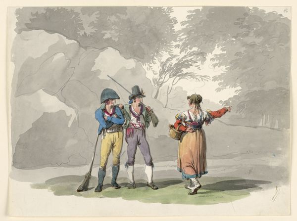 Curator: This watercolor illustration, simply titled "Parting," hails from the 18th or 19th century and presents a genre scene rendered in print form. The artist remains anonymous, which perhaps lends a universal quality to this snapshot of English social life. Editor: First glance? These fellas look like they are desperately trying to one-up each other with exaggerated enthusiasm. And their clothes—like a clown convention crashed a romantic picnic. Curator: Precisely! The Romantic style, characterized here by heightened emotion, intersects intriguingly with caricature, amplifying details for comic effect. Note the almost grotesque elongation of their faces. It pushes past mere representation. Editor: Yeah, look at the stripes on the trousers, the outrageous collars—the whole thing is theatrical. Their parting seems less about genuine farewell and more a competition for who can perform politeness better. Almost passive-aggressive. Curator: The watercolor technique allows for subtle gradations in color. Observe how these blend with crisp lines, especially in the depiction of their garments. This adds depth while preserving the work’s inherent graphic quality, a feature of its medium: printmaking. Editor: The sparse landscape adds to this feel. Barely-there trees in the background…it's like the real drama happens between them, this staged goodbye. Curator: The inscription adds an explicit textual element, solidifying the work as social commentary. "Well a...Good morning! Glad I See Ye well!," speaks of social niceties—revealing this performance's true focus on rigid and somewhat absurd societal expectations. Editor: The "God bless ye!" adds extra sweetness, even mock reverence, right? As if after outdoing the first impression, he has to layer in a heavy dose of piety as a closing argument to clinch victory. Curator: In conclusion, “Parting,” offers a small window onto a broader critique through its deliberate, formal, and theatrical construction and composition. It reveals the societal dance in Romantic-era England. Editor: Ultimately, the artist captures perfectly how even the simplest social rituals become battles fought on a field of awkward pleasantries and passive one-upmanship. "Parting," becomes ironically, the meeting point of subtle critique and riotous caricature.