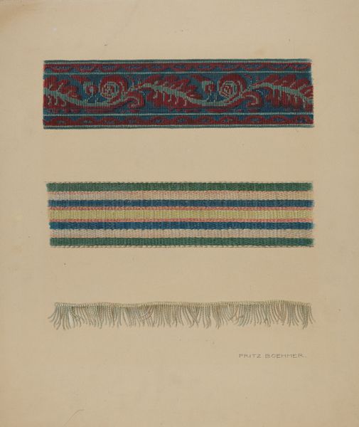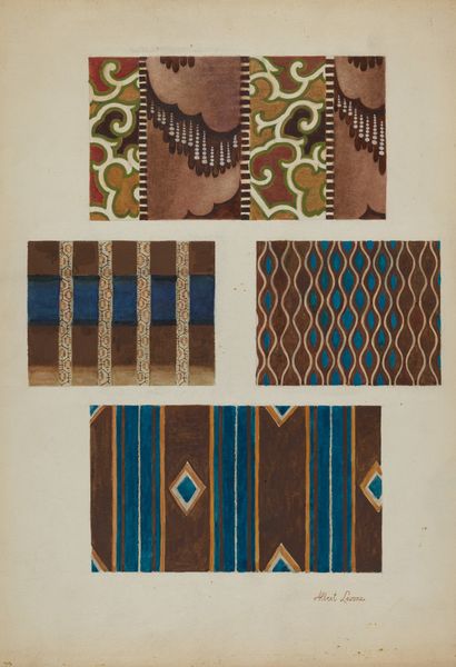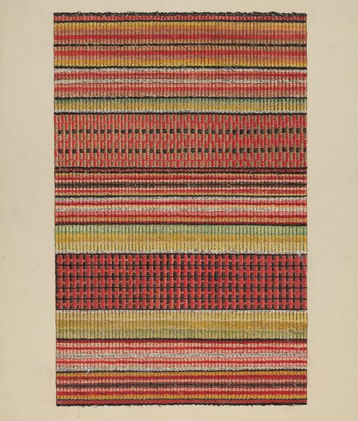 Curator: Before us, we have a "Textile," dating roughly from 1935 to 1942, its creator remaining anonymous, representing Indigenous-Americas artistry through weaving techniques. What are your initial thoughts? Editor: A study in browns and creams primarily, offset with blues and subtle golds. I am immediately drawn to the interplay between horizontal linearity and those fantastic, almost bursting star shapes. There is tension there; the colours contribute to a grounded earthiness countered by an explosion of colour. Curator: It’s intriguing to think about the labor embedded within each woven thread, the community involvement, or lack thereof, in creating such an item. Who would be its likely intended consumer? Where were the raw materials sourced? Were specific workers chosen to achieve this detailed symmetry and harmony that appeals to your artistic sensibilities? Editor: Well, breaking down the visual components further, one sees an arrangement built on repeated, regulated intervals. The artist's methodology clearly adheres to structural rhythms that create satisfying balance; I am also deeply drawn to the formal structure here. Curator: And what can be told regarding economic context of this item? A singular maker expressing purely artistic concepts or maybe a cog within systems of commerce and societal expression, even oppression? How might the piece challenge, reinforce, or re-negotiate prevailing socioeconomic norms? Editor: Undoubtedly there are messages in these shapes; even now in our modern milieu. Curator: Indeed; even material conditions play such crucial parts to a final object's impression on future generations. For me it deepens the understanding as appreciating formal aspects alone is not enough. It should be appreciated considering its social framework! Editor: To think of it in that vein provides such deeper meaning beyond immediate appeal, certainly broadening awareness by considering labor and circumstance which enriches the piece. Curator: It is only when you examine history intertwined with technique that beauty grows richer. Editor: I couldn't agree more—that our different lens converge on a fuller recognition.