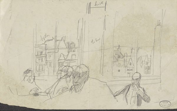 Curator: Here at the Rijksmuseum we have a pencil and pen drawing titled "Theatervoorstelling," or "Theater Performance," by Isaac Israels, dating from approximately 1915 to 1925. What are your initial impressions? Editor: It strikes me as quite raw, almost ephemeral. The sketchiness emphasizes the transient nature of a performance, as if the scene might vanish at any moment. Curator: Yes, and it’s fascinating how Israels uses the pen and pencil to differentiate between the foreground and background. Notice the darker, denser strokes delineating the audience, in contrast to the lighter, almost ghostly lines representing the stage and set. Editor: I’m intrigued by what seems to be depicted on the stage. Figures gathered near water…perhaps a reference to classical mythology, a voyage, or a fateful departure? The ambiguity heightens the symbolic potential. Curator: Precisely. Israels captures a theatrical moment, but through its open-ended representation, he encourages the viewer to project their own interpretations onto the scene. Look closely at how the stage's architecture is defined with a simplified orthogonal design against the atmospheric background and a collection of figures with fluid outlines. This reinforces a spatial tension, further abstracting any immediate meaning. Editor: Also consider how he positions the audience – shadowed and collective – as witnesses, drawing a parallel between the act of watching and our own role as observers of the artwork. It becomes a meditation on spectatorship itself. The shared communal experience and how we reflect our inner experiences when seeing symbols on a stage. Curator: That's a perceptive observation. It demonstrates Israels’ capacity to layer visual structure with subtle layers of conceptual depth. This particular pen sketch represents a dynamic convergence of spatial arrangement and implicit content. Editor: Ultimately, this sketch speaks to the enduring allure of theatre, to how performances shape our cultural memory. Even in its unfinished form, this study contains a universal resonance about storytelling and cultural archetypes.